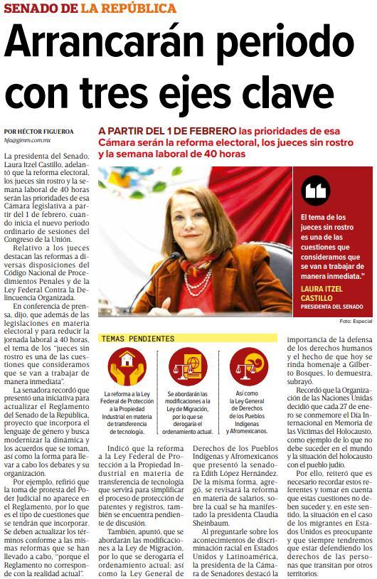 La presidenta de la Mesa Directiva de la Cámara de Senadores, Laura Itzel Castillo Juárez, informó que entre los temas prioritarios a incluir en la agenda legislativa de Morena para el segundo periodo de sesiones ordinarias de la Cámara Alta, que iniciará el próximo 1 de febrero, misma que habrá de aprobarse durante la reunión parlamentaria de la bancada senatorial morenista a realizarse el siguiente domingo, destacan aquellas reformas que no se pudieron concretar en el primer periodo ordinario.