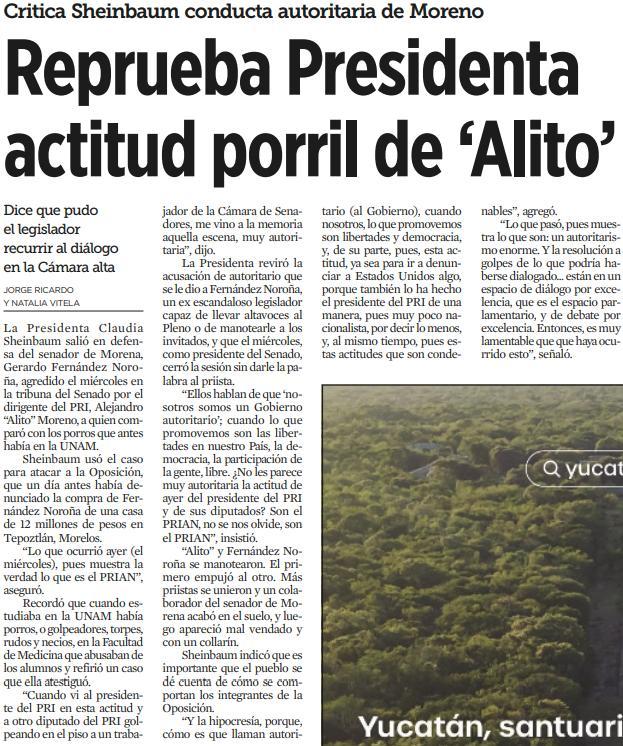 La presidenta Claudia Sheinbaum Pardo afirmó que el senador Alejandro Moreno Cárdenas y los diputados priístas que agredieron físicamente al presidente de la mesa directiva del Senado, Gerardo Fernández Noroña, y a un fotógrafo de ese recinto legislativo mostraron lo que es el Prian: “porros, autoritarios e hipócritas”.
