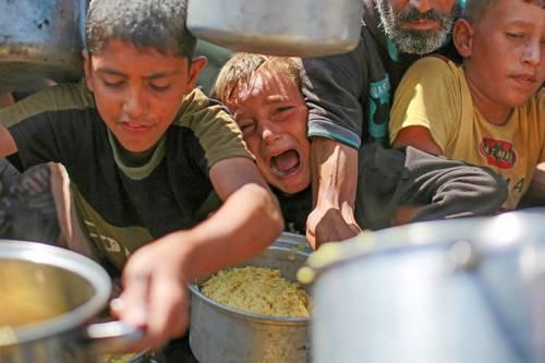 ▲ Habitantes de la zona occidental de Gaza piden raciones de arroz en un comedor de una organización humanitaria. La semana pasada la ONU declaró que la ciudad padece hambruna por la sistemática obstrucción de la ayuda por parte de Israel.Foto Afp