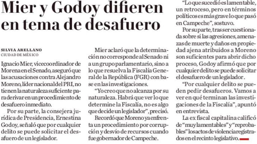 El eventual desafuero del senador priísta Alejandro Moreno Cárdenas generó ayer posiciones encontradas entre los morenistas. Mientras la consejera jurídica de la Presidencia de la República, Ernestina Godoy, aseguró que se puede pedir ese juicio por cualquier delito, el vicecoordinador del partido guinda en la Cámara alta, Ignacio Mier, estimó que lo sucedido no alcanza para iniciar el procedimiento en San Lázaro.