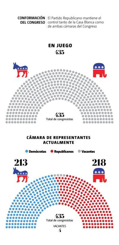 Actualmente los demócratas cuentan con 220 escaños en la Cámara Baja, contra 215 de los demócratas. En el Senado los republicanos son 53 frente a 45 demócratas y dos independientes, Berne Sanders y Angus King, que votan con los demócratas