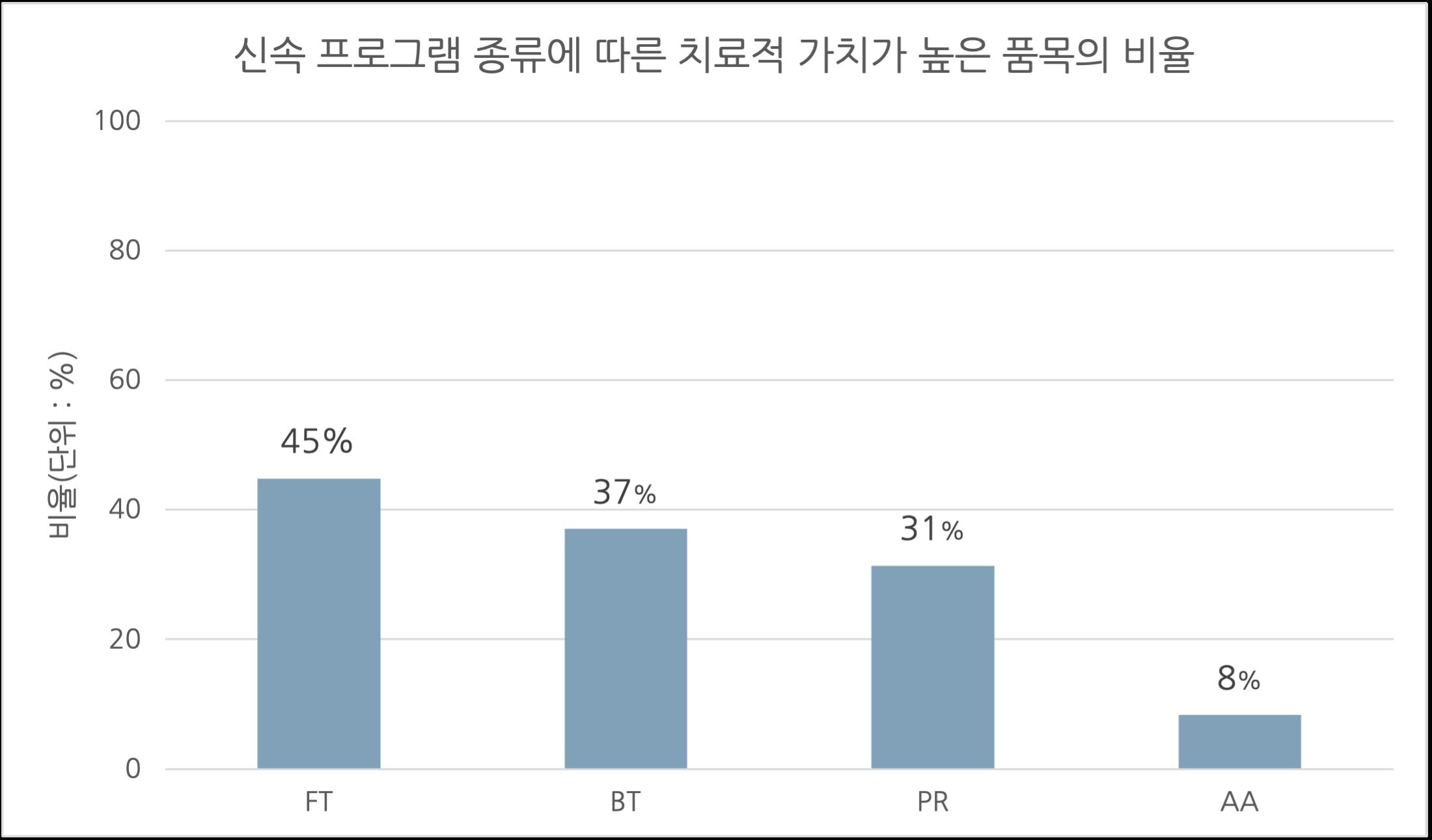 [허가팀] 국내 신속심사 제도의 현황 및 시사점 서울대학교 약학정책연구회 55 1.3.2. 신속 프로그램 종류에 따른 분석 FDA의 네 가지 신속 프로그램에 따른 치료적 가치가 높은 품목의 비율을 조사하였다(그림5). Fast Track(FT), Breakthrough Therapy(BT), Priority Review(PR), 그리고 Accelerated Approval(AA)을 적용 받은 품목 중 높은 치료적 가치를 지닌 것으로 평가 받은 품목의 비율은 각각 44.8%(13/29), 37.0%(10/27), 31.4%(16/51), 그리고 8.33%(1/12)이었다 Fast Track을 통해 허가된 품목은 그렇지 않은 품목에 비해 치료적 가치가 뚜렷하게 높은 것으로 나타났고(Odds ratio=6.825, p=0.001), Breakthrough