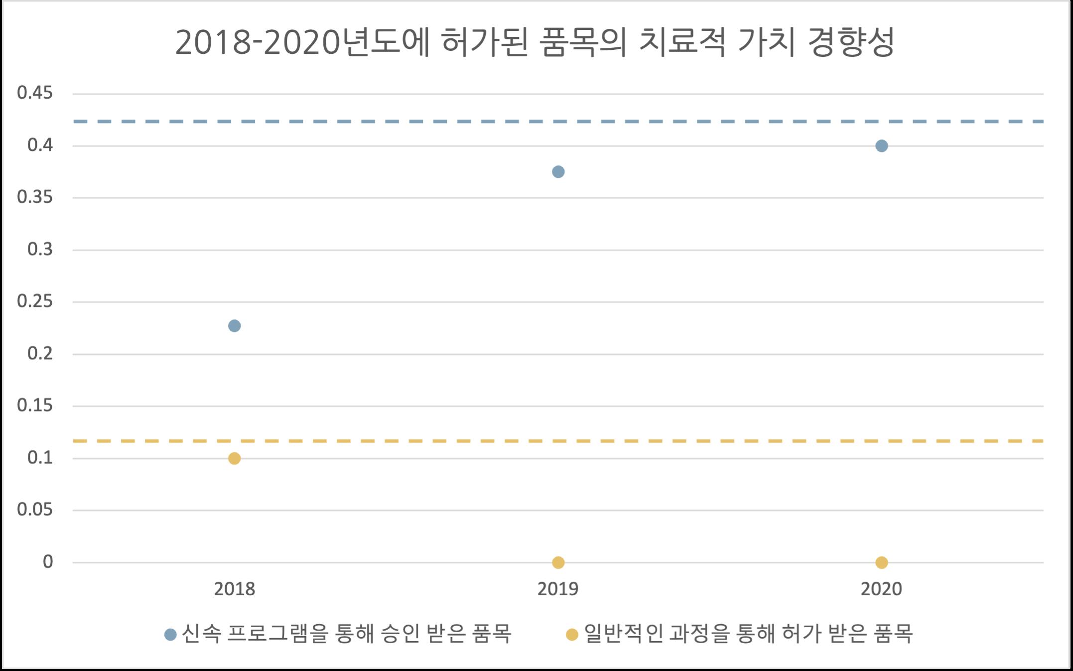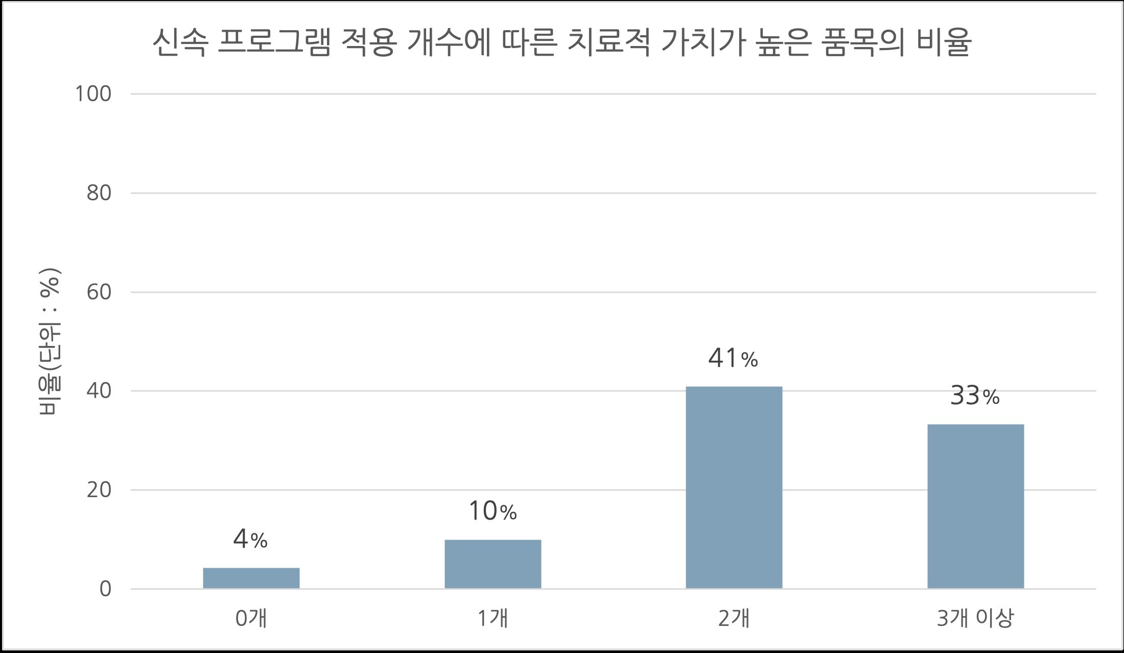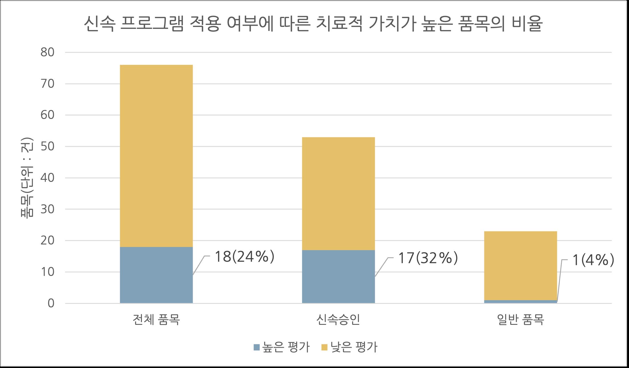 [허가팀] 국내 신속심사 제도의 현황 및 시사점 서울대학교 약학정책연구회 53 대하여 치료적 가치 평가를 분석하고 신속 프로그램 남용 논란에 대한 의견을 제시하고자 한다. 1.2. 분석 방법 연구 방법은 Hwang의 선행 연구에 사용된 방법론을 참고해 설계하였다(Hwang, 2020). 2018년부터 2020년까지 FDA로부터 허가를 받은 품목은 FDA의 데이터베이스를 이용하였다 2018년 1월 1일부터 2020년 12월 31일까지 허가된 품목의 목록을 작성하였는데, 2021년 이후에 허가된 품목에 대해서는 치료적 가치 평가 결과가 부족하여 통계적으로 유의성이 있는 결론을 도출하기 어려워 제외하였다 또한 조사 대상 품목의 신속 프로그램 지정 여부 및 종류에 대한 자료도 동일한 방법으로 수집하였다 조사 대상 품목의 치료적 가치(Therapeutic value)는 프랑스의 HAS(French National Authority for Health)와 독일 IQWiG(Institute for Quality and Efficiency in Health Care)의 국가 기관 및 비영리단체(Prescrire)에서 제공하는 치료적 가치 평가 자료를 참고하였다 해당 기관에서는 새로 개발된 의약품이 기존의 의약품에 비해 얼마나 임상적으로 유익(Clinical added benefit)한지 각자의 기준에 따라 등급을 나누어 평가한다 본 연구에서는 서로 다른 등급 체계를 통일하기 위해, HAS의 ‘Moderate’와 ‘Substantial’, IQWIG의 ‘Proven’, 그리고 Prescrire의 ‘Clear advance’을 치료적 가치가 높은 것으로, 그 외의 평가는 치료적 가치가 낮은 것으로 분류하였다 이는 규제 당국에서 보험 및 상환 여부 결정을 위해 사용하는 기준과 동일하게 적용된 것이다. 하나의 평가 기관이 조사 대상 품목에 대하여 두 가지 이상의 등급을 매긴 경우17 가장 높은 등급을 채택하였다 또한 하나의 품목이 두 가지 이상의 기관에서 평가를 받은 경우에도 그 중에서 가장 높은 등급을 채택하였다 수집한 치료적 가치 평가 자료를 바탕으로 치료적 가치가 높은 품목에 대해 분석하였다 신속 프로그램 적용 여부, 적용된 신속 프로그램의 종류 및 개수에 따라 치료적 가치가 높은 품목의 비율을 계산하였다. 또한 본 연구의 목적을 달성하기 위해 계산 결과를 비교하였으며, Odds ratio 및 p value를 근거로 통계적 유의성을 입증하였다. 데이터 분석에는 Microsoft Excel(version 16.64)를 사용하였다. 1.3. 분석 결과 1.3.1. 신속 프로그램 적용 여부에 따른 분석 2018년부터 2020년까지 FDA는 총 160개의 품목을 허가하였으며, 그 중 신속 프로그램이 1개 이상 적용된 품목은 107개(66.9%)였다. 전체 품목 중 조사 기관에서 평가 결과를 공개한 76개의 품목에 대하여 18개(23.7%)의 품목이 치료적 가치가 높다고 평가받았다. 신속 프로그램 적용 여부에 따라 구분한 경우 치료적 가치가 높은 품목의 비율은 다르게 나타났다(그림3). 신속 프로그램을 1개 이상 적용 받은 품목과 그렇지 않은 품목은 그 비율이 각각 32.1%(17/53)과 4.35%(1/23)로, 신속 프로그램을 적용 받은 품목이 치료적 가치가 더 높았다(Odds ratio=10.4, p=0.028). 17 적응증에 따라 평가 결과가 다른 경우 등