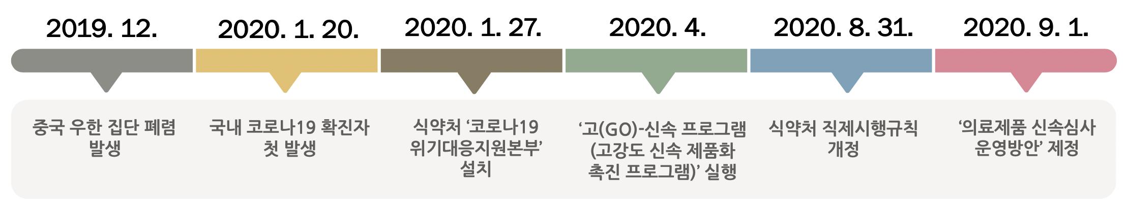 [허가팀] 국내 신속심사 제도의 현황 및 시사점 서울대학교 약학정책연구회 47 3. 한국의 신속 프로그램 3.1. 한국 신속 프로그램의 도입 이전 내용과 도입 배경 그림2 한국 신속 프로그램 타임라인 2019년 12월 중국 우한 집단 페렴 발생, 2020년 1월 20일 국내 코로나19 첫 발생, 2020년 1월 27일 식약처‘코로나19 위기대응지원본부 설치, 2020년 4월‘고(GO) 신속 프로그램(고강도 신속 제품화 촉진 프로그램)’실행, 2020년 8월 31일 식약처 직제시행규칙 개정, 2020년 9월 1일‘의료제품 신속심사 운영방안 제정 2019년 12월 중국 우한에서 새로운 유형의 코로나바이러스로 인한 호흡기 질환이 발생하였고 2020년 1월 8일 중국 우한시를 방문하였던 우한시 입국자의 확진으로 국내 코로나19 상황이 시작되었다. 이에 2020년 1월 27일, 식약처 내에는 코로나19 위기대응지원본부가 설치되어 지원본부 내 백신팀이 예방백신위기대응 및 허가 간소화