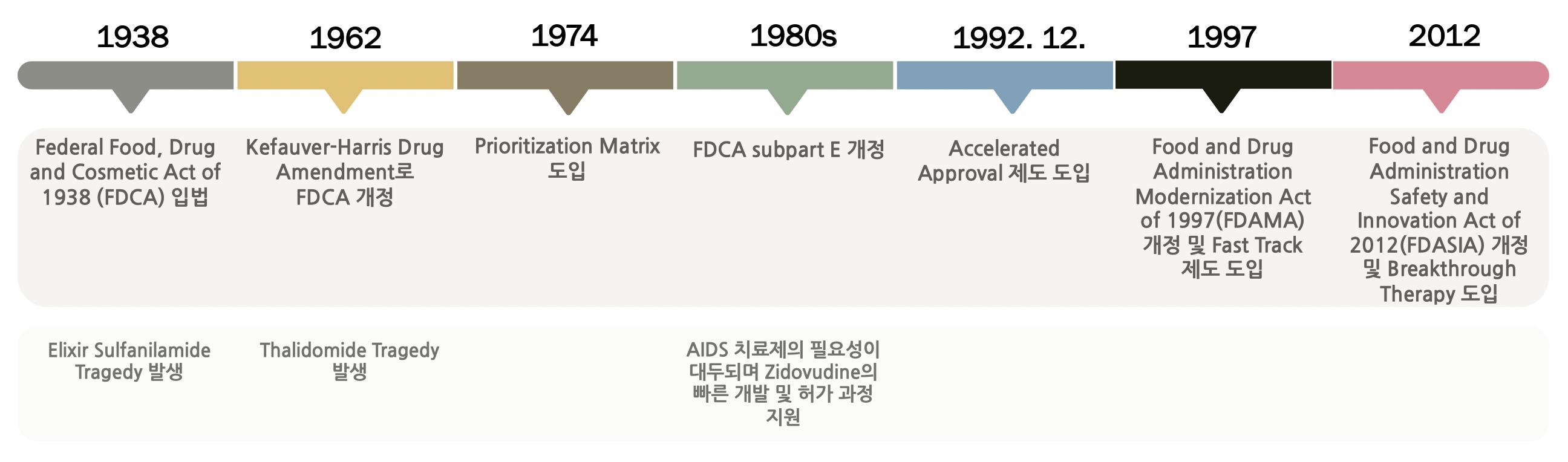 [허가팀] 국내 신속심사 제도의 현황 및 시사점 서울대학교 약학정책연구회 43 새로운 의약품 개발 시 FDA에 검토와 승인을 거치는 현대의 제도는 1938년 Federal Food, Drug and Cosmetic Act of 1938(이하 FDCA)의 입법으로부터 시작되었다. 1938년, Elixir Sulfanilamide Tragedy로 인해 입법되었다. 이 법으로 인해 의약품 제조업체는 신약을 시판하기 위해서 FDA에 제품의 안전성을 입증하고, 승인 절차를 거치게 되었다 1962년 Thalidomide Tragedy로 인해 입법부는 Kefauver Harris Drug Amendment를 통해 FDCA를 개정한다. 의약품 제조업체가 신약의 안전성과 효능을 입증하는 실질적인 증거를 제출하도록 의무화하여 현대 임상시험 단계의 토대를 마련하였다 의약품마다 개발 및 승인 절차에 소모되는 시간과 비용이 다르지만, 1962년 Kefauver Harris Drug Amendment를 통한 개정으로 IND와 NDA를 검토하게 되면서 새로운 화합물의 임상 개발 기간이 점차 증가하는 추세였다. 1960년대와 1970년대의 임상 개발에는 평균 7.9년, 8.2년이 걸렸다는 추정이 있으며, 1980년대와 1990년대에 가면서 개발 기간은 더욱 늘어났다. 1990년대 미국 및 유럽연합(EU)에서 출시된 제품은 특허출원부터 시장 출시까지 평균 개발기간이 9.7년에 달하였으며, 2000년 이후 마케팅을 시작한 제품은 13.9년으로 늘어난 것으로 분석됐다. 임상시험 기간이 늘어나는 것과 맞물려 새로운 화합물의 개발 비용도 크게 올랐다. DiMasi의 한 연구에 따르면, 1983년~1994년 사이에 임상시험을 거쳐 1997년 전후로 출시된 의약품의 총 개발 비용은 약 $8023으로, 이는 10년 차이인 1970년 1982년 사이 임상시험을 거쳐 1984년 전후로 출시된 의약품의 총 개발 비용의 2배가량이나 높았다 특히나, 시간에 관련된 비용이 총 비용의 절반을 차지한다는 증거가 제시되었고, 임상시험 비용이 시장 승인을 위한 비용 증가에서 큰 몫을 차지한다고 분석되었다 새로운 의약품 개발에 소요되는 시간과 비용이 증가되는 것과 함께, 질병에 대한 병리학적 이해가 증강되고 질병의 조건들을 과학적으로 규명하게 되면서 신약 승인에 있어 신속한 승인을 촉진하는 제도들이 도입되었다. 가장 먼저 도입된 것은 1974년 FDA에 의해 규격화된 Prioritization Matrix이며, 제도가 더욱 세분화되고 발전됨에 따라 현재의 4가지 신속승인 제도4 가 도입되었다. Original Prioritization Matrix는 FDA가 1974년부터 1992년 1월 1일까지 사용했던 제도이다 FDA 내부적으로 IND와 NDA를 검토할 때, 우선 순위를 매기기 위해서 의약품의 화학적 유형과 치료 효과를 분류하는 Matrix를 사용하기 시작했다. 분류된 약물의 분류 순위가 높을수록 검토자는 NDA 검토 우선순위를 높게 책정하여 자료의 조기제출을 포함한 여러 혜택을 제공했다. 1978년 FDA가 일반적으로 NDA를 승인하는데 평균 32개월이 걸렸던 것에 반해, Priority Matrix를 통해 새로운 화합물로 분류된 21개 NDA가 평균 21개월만에 승인되었다. 3 2000년도 달러환율 기준 4 Fast Track, Breakthrough Therapy, Accelerated Approval, Priority Review. and Drug Administration Modernization Act of 1997(FDAMA)를 개정하며 Fast Track 제도 도입, 2012년 Food and Drug Administration Safety and Innovation Act of 2012(FDASIA)를 개정하며 Breakthrough Therapy가 도입