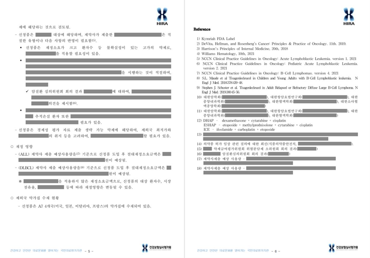 재정 효과에 대한 후속 연구가 필요하다 그러나 심사평가원 등을 통해 대중에게 공개되는 자료는 계약의 세부적인 숫자와 평가의 이유 등이 가려져 있어(그림5) , 관계자 이외의 연구자들은 어떤 위험분담계약이 객관적으로 합당한지 평가하기 어렵다. 따라서 심사평가원, 국민건강보험공단 등에서 고가 신약의 사용 비율 등의 자료를 보다 적극적으로 공개해야 할 필요가 있다