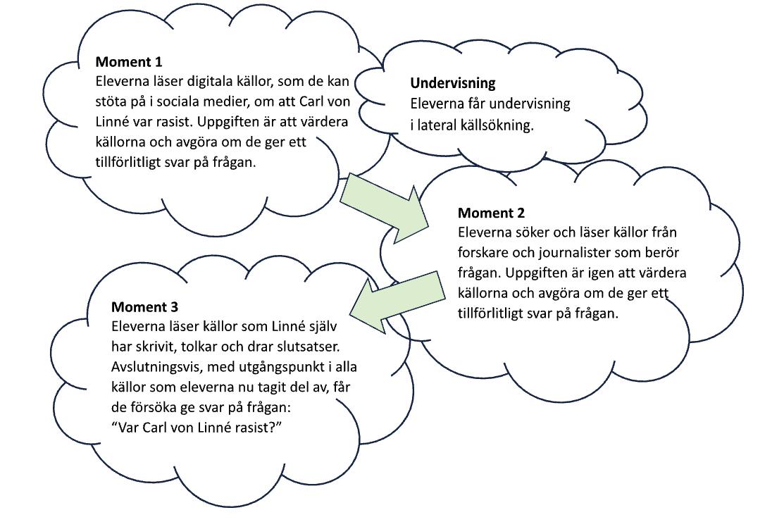 Eleverna introduceras till lateral läsning - en metod för att snabbt och effektivt kontrollera en källas trovärdighet genom att söka information om den utanför ursprungskällan. I en övning undersöker eleverna exempelvis en forskare, Robert Malone, som påstår att COVID-19-vaccin är farligt. Genom lateral läsning upptäcker de att forskaren sprider falsk information och saknar stöd från det vetenskapliga samfundet. Denna praktiska erfarenhet ger eleverna verktyg att undersöka en källas trovärdighet och därmed undvika att okritiskt acceptera påståenden från enstaka röster, oavsett hur övertygande de kan framstå.