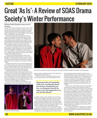 Great âAs Isâ: A Review of SOAS Drama Societyâs Winter Performance Katherine Suzette Vizcaino, MSc Violence Conflict & Development The play âAs Isâ, written by William M. Hoffman, gives a view into the explosion of the HIV/AIDS epidemic in the 1980s, through the changing relationship of couple Saul and Rich, while overlaying an overview of the LGBTQI community and their own relationship to the world at large. Rich (played by Emanuele Frascadore), the infected partner, was presented as the stereotypical gay man of the 1980s, flirty, unfaithful, interested in arts, clubbing, drinking and having as many sexual liaisons as possible. He was an ascending writer rejecting the âconventionalâ partnership desired by his partner Saul (Konrad Suder Chatterjee), his fame curtailed by a disease no one knew much about. Richâs friends and family had their own fears: of catching the disease; of spreading it themselves; of being tainted by association; of shame and ignorance. The entire medical community struggled to understand the causes of HIV or how to stop it. Rich is so terrified of the path to his death that he is constantly trying to push everyone away, while simultaneously being terrified of being alone. He broke up with Saul and spurned his offers of support during treatment, with the audience not sure if it was heartfelt, or a covert offering of protection for his ex-partner. Saul was hurt by Richâs rejection of him and their romantic relationship â but not enough to turn his back on a friend in trouble. Though Saul himself was afraid of contracting the disease, his love and compassion overrode the fear and enabled him to be a mountain of support. You feel for Saul trying so desperately to give someone he loves comfort while knowing as the onlooker, that he also needed comfort himself. Chatterjeeâs performance as Saul was wonderfully nuanced, the stalwart friend, partner, and moral conscience of the play. His love for Rich was the abiding and sincere love of a life partner, with a deep loyalty and belief in the âgood times and bad, till death do us partâ wedding vow, even when same-sex marriage was not only rejected but ridiculed - with stereotypes painting gay men as incapable of feeling the same type of love as hetero couples all too common. Frascadore was most effective in the bedridden scenes, deflecting pain with sarcasm through tears, and letting the