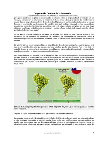 El inicio de la campaña publicitaria peruana: "Chile, despídete del pisco", y su parodia publicada en Chile como respuesta. ¿Quién le copia a quién? Imitaciones peruanas a las medidas chilenas La campaña peruana sobre la situación en dos Estados de USA, sin embargo, puede ser falsamente alegre y estar ocultando en realidad la atención popular de un hecho que, en términos de mercado, debiese ser mucho más preocupante para los defensores del pisco peruano, y que ciertamente debe concentrar en silencio el mayor número de sus expectativas: los beneficios que obtendrá el pisco chileno a partir del