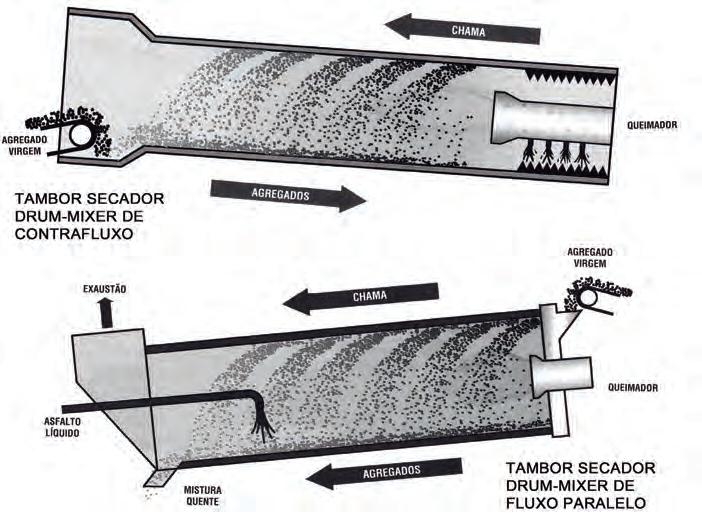 ângulo de inclinação. Nas usinas do tipo drum-mixer, o fluxo pode ser paralelo ou por contrafluxo.