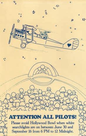 Few things can sour a symphony or scuttle a soulful song like uninvited noise. Not long after airplanes and helicopters became regular sights in the Los Angeles sky, the Hollywood Bowl began outreach to the local FAA o ce and pilots’ associations to prevent aircraft from passing over the Bowl during concert-season evenings. Sometimes, though, we all need a reminder. For decades, posters would be hung in pilot lounges at commercial and private airfields in the area. This artwork was meant to be eye-catching, would sometimes play o a theme from the season, and became a fun and colorful genre seen by few of those who didn’t have their pilot’s license. Enjoy this look back on designs created throughout Bowl history.