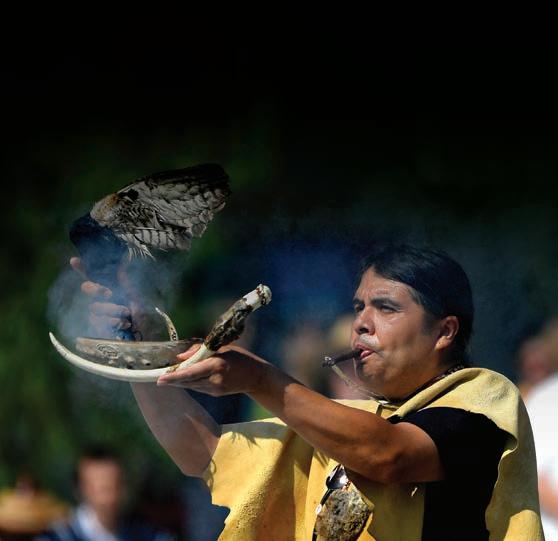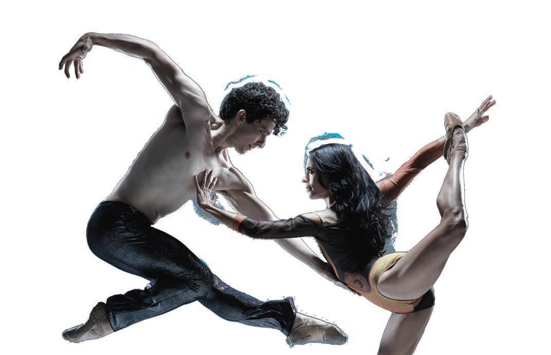 Andy Morales of the Gabrieleno Tongva San Gabriel Band of Mission Indians offers a blessing at the opening of the newly renovated plaza at The Music Center, now known as Jerry Moss Plaza. Photos: John McCoy for The Music Center; right photo: ABT’s Katherine Williams and Blaine Hoven perform the pas de deux in A Time There Was at The Music Center.