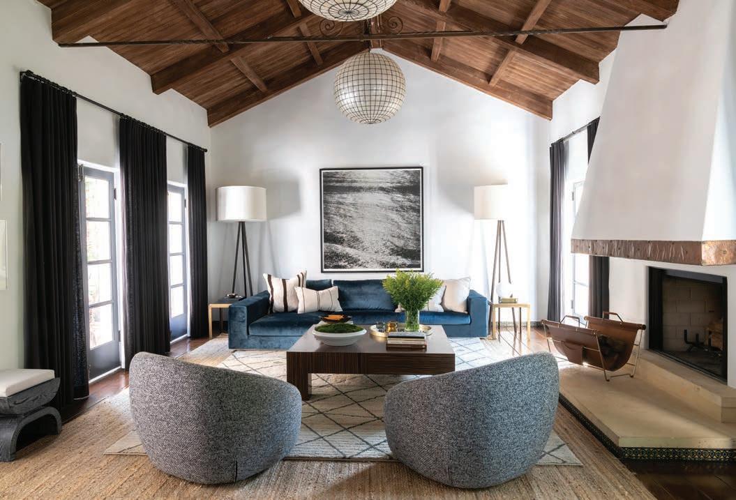 of the home’s Spanish Revival architecture without being constrained by it. She introduced a warm, masculine aesthetic; dining and living spaces effortlessly spilling onto tranquil patios enhanced the indoor-outdoor sensibilities.