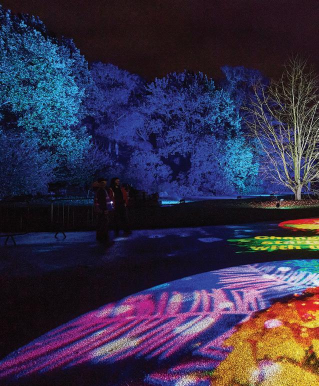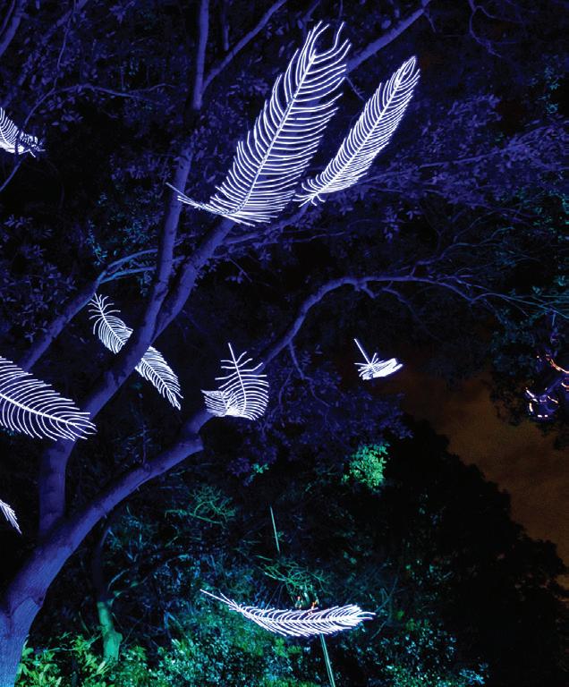 scape in endlessly creative ways. Multicolored floating lights enhance a waterlily pond; while neon striping outlines a copse of bending trees. Meandering from one patch to the next creates an otherworldly effect—like being in a fairy land or on another planet.