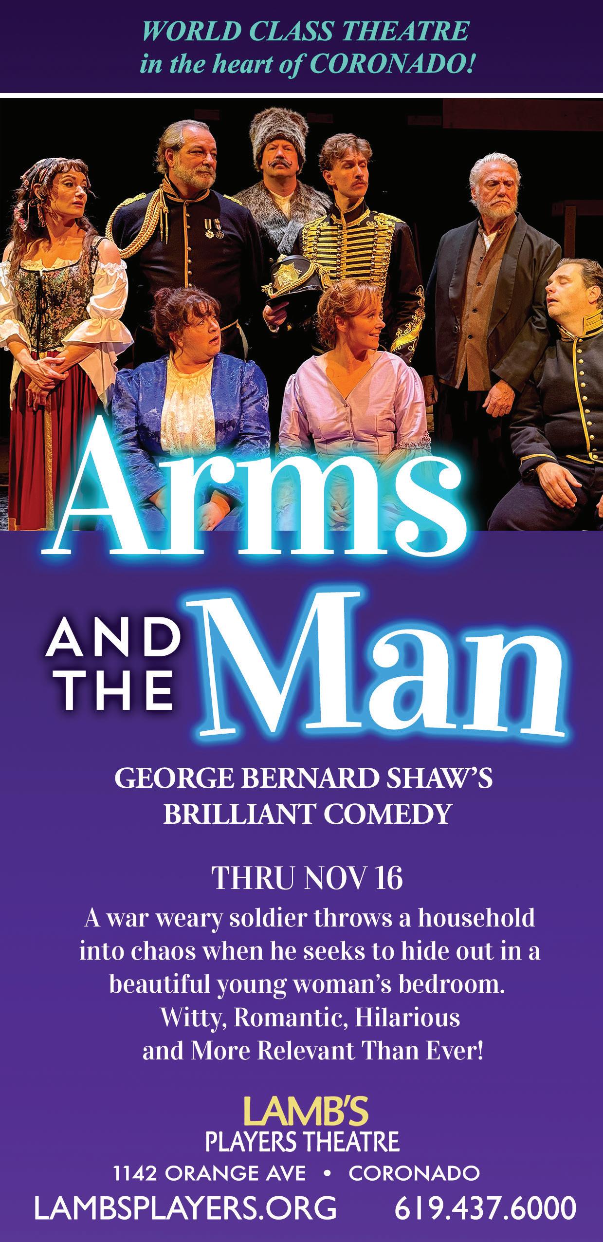 CENTERED ON a war-weary soldier who causes chaos while hiding out in a young woman’s bedroom, George Bernard Shaw’s comedy, Arms and the Man, lights up the stage at Lamb’s Players Theatre, through Nov. 16. lambsplayers.org Inspired by the 1988 film, the worldpremiere musical, Working Girl, has been extended at La Jolla Playhouse through Dec. 7—based on the book by Theresa Rebeck, with music and lyrics by Cyndi Lauper. At The Old Globe, two beloved holiday productions return. Dr. Seuss’ How The Grinch Stole Christmas! runs Nov. 5Dec. 31; along with an additional special concert presentation of ¡Cómo el Grinch robó la Navidad!, Nov. 21-22. The Globe presents Ebenezer Scrooge’s BIG San Diego Christmas Show, Nov. 21Dec. 28. Set in San Diego circa 1919, the comedy is a fastpaced parody of the Dickens play—featuring the Ghosts of Christmases Past, Present and Future. theoldglobe.org