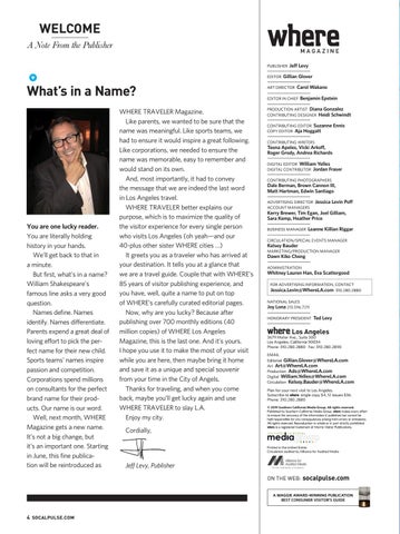 3679 Motor Ave., Suite 300 Los Angeles, California 90034 Phone: 310.280.2880 Fax: 310.280.2890 EMAIL Editorial Gillian.Glover@WhereLA.com Art Art@WhereLA.com Production Ads@WhereLA.com Digital William.Yelles@WhereLA.com Circulation Kelsey.Bauder@WhereLA.com Plan for your next visit to Los Angeles. Subscribe to where: single copy $4, 12 issues $36. Phone: 310.280.2880 © 2019 Southern California Media Group. All rights reserved. Published by Southern California Media Group. where makes every effort to ensure the accuracy of the information it publishes but cannot be held responsible for any consequences arising from errors or omissions. All rights reserved. Reproduction in whole or in part strictly prohibited. where is a registered trademark of Morris Visitor Publications.