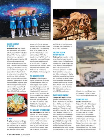Creation & Earth History Museum God may have made the world in seven days, but you only need 45 minutes to tour this East County museum that shows “how it was done.” Exhibits include a garden filled with dinosaur statues, rooms set up to show what the Earth looked like during each day of the creation, and a display dedicated to showing how Noah’s Ark could have carried all the animals of the Earth. Although the museum is made for a Christian base, officials admit 30 percent of visitors are actually skeptics. 10946 Woodside Ave., Santee, 619.599.1104, creationsd.org