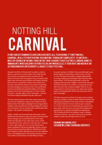 Carnival If one subject dominates our consciousness all year round, it's Notting Hill Carnival, in all its frustrating, fascinating, turbulent complexity. Planted almost by chance in the mid-1960s in the then-shabby streets of West London, home to immigrants who could not afford to live anywhere else, it took root and grew at an astonishing rate into Europe's largest street festival. Despite the efforts of friend and foe alike to claim it, abuse it, uproot it or chop it down, this hardy annual has not just survived but thrived, and thrown off dozens of shoots that have grown into successful Caribbean-style carnivals across Britain and Europe. Notting Hill Carnival is a powerful creative and cultural force that has nurtured the talents and careers of hundreds of artists, designers, musicians, even a few politicians, and has enthralled and inspired millions of ‘ordinary’ people over its 40-something years. For the London economy - though sadly not for carnivalists - carnival has borne highly profitable fruit year after year. We have heard rumours that other events take place over the last weekend in August, but frankly we don’t believe them. We might campaign for the August Bank Holiday to be renamed the Carnival Holiday, for there is only one place to be on Sunday 29th and Monday 30th August - the streets of Notting Hill. Sadly, a curfew was imposed three years ago, and no doubt that will remain in place this year. A more benign recent change was a small alteration in the route, where the ‘dog leg’ in the south west corner, which involved three turns, with now only have one - making it a strict right angle. So 70 or so mas bands and a dozen steelbands will be (exceedingly slowly) circulating clockwise along Great Western, Westbourne Park and Chepstow Roads, Westbourne Grove and Ladbroke Grove. The judging-point, VIP seating and press enclosure will be at the bottom of Great Western Road. 17 sn july 2012