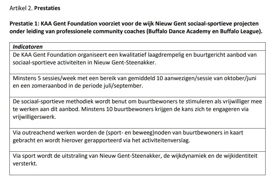 KAA Gent Foundation - de coördinatie en organisatie van sociaal-sportief werk, waarbij de persoonlijke ontwikkeling van mensen en/of het sociale weefsel in de samenleving wordt versterkt. Bijzondere aandacht gaat daarbij naar de participatie, integratie en emancipatie van mensen uit kansengroepen.