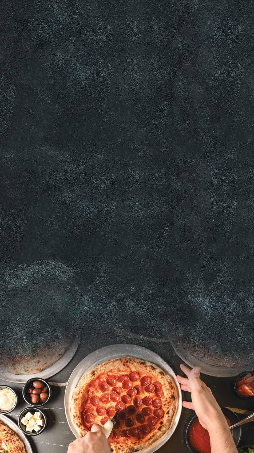 Todas nuestras pizzas son elaboradas en una delgada masa estirada a mano, siguiendo la receta original napolitana con bordes inflados, en un horno de ladrillo a 400° C.