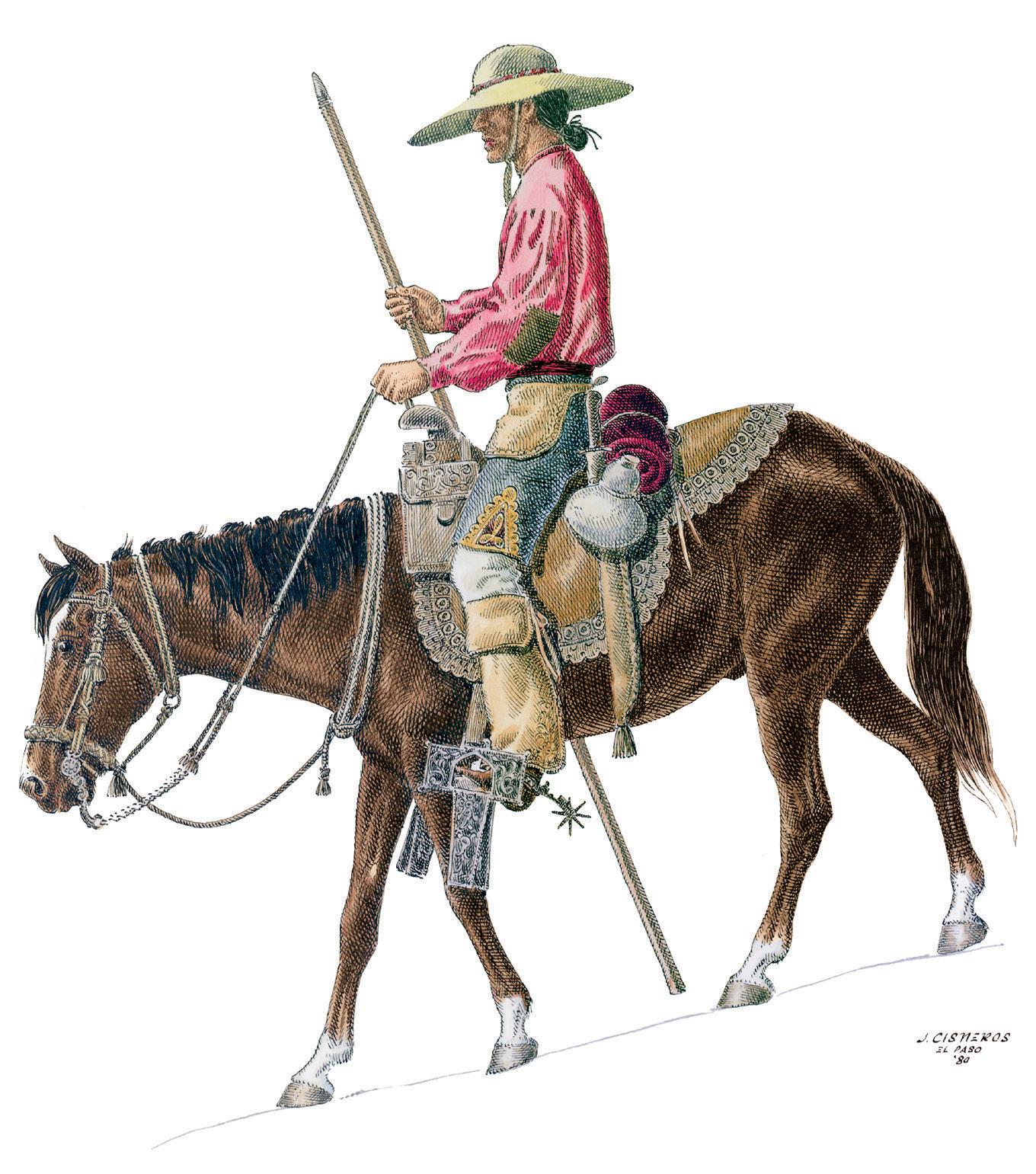 What began in the New World in 1521 when Gregorio Villalobos brought the first cattle to the banks of the Río Pánuco near present-day Tampico, Mexico, the skills used to harvest cattle and herding followed the trail of Spanish and Mexican settlement north to the banks of the Río Bravo/ Río Grande. Here, herding traditions developed as the demand for hides and tallow shifted to include a demand for beef as a food source. Tools like the hocking knife were replaced by the lazo (lasso). Ironically, the equipment and tradition the vaquero developed over the next 200 years would become such a vital part of the iconic cowboy image of the present.