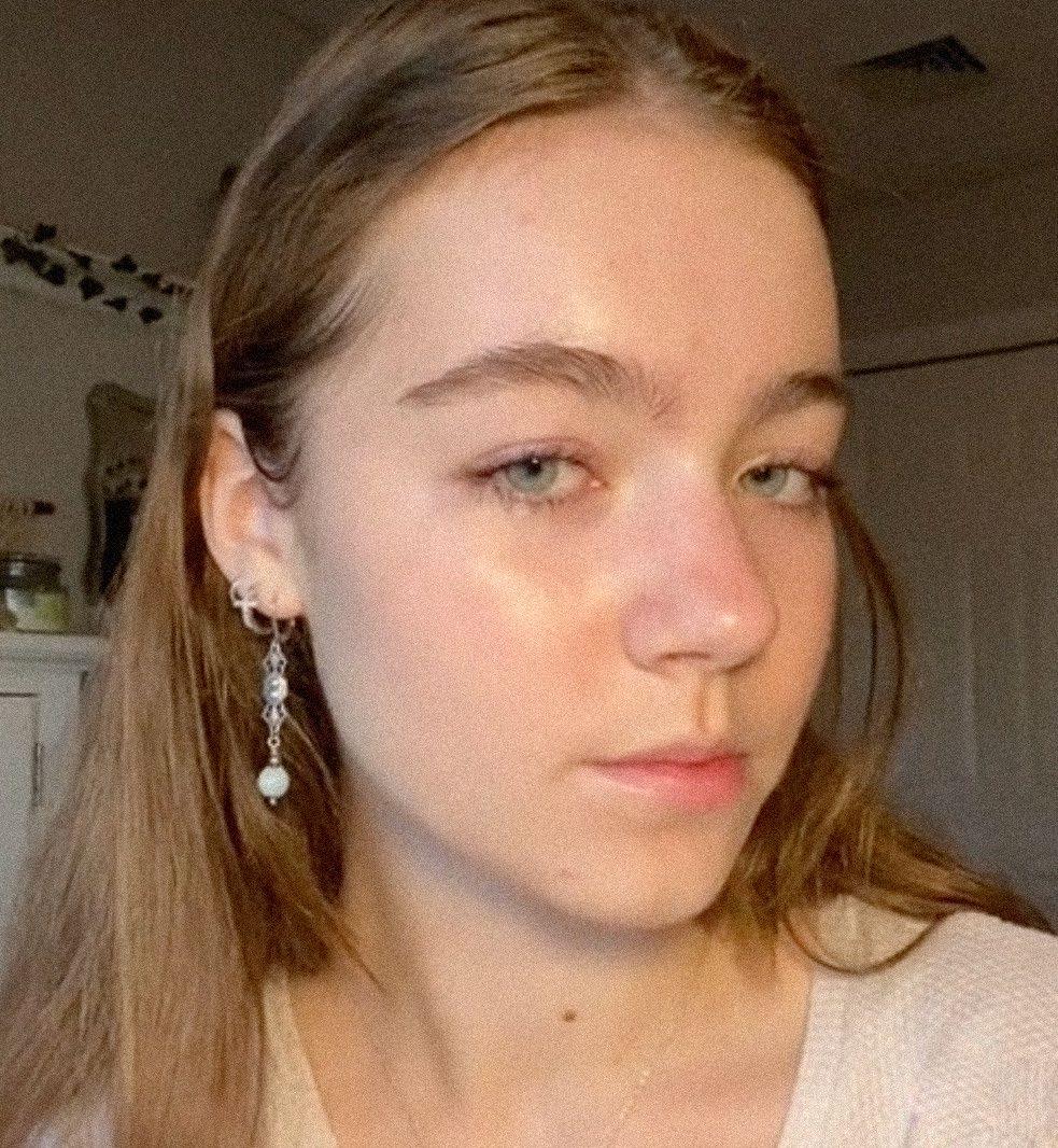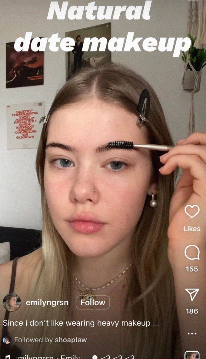 SIMPLE MAKEUP THAT EMPHASIZES FLUFFY BROWS, GLOWING SKIN AND LIPS. LESS FOCUS IS PLACED ON THE EYES.