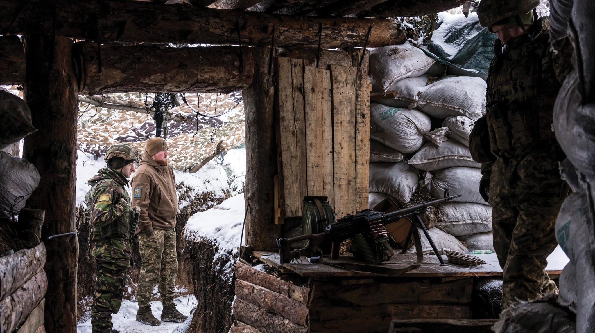 Ukrainian soldiers in a trench on the front lines in Popasna, Ukraine.