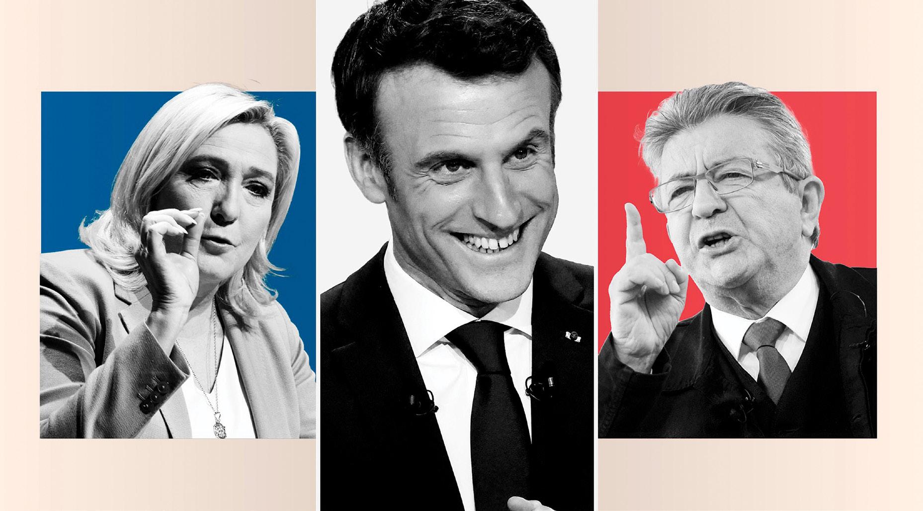 Marine Le Pen (left), Emmanuel Macron (center), and Jean-Luc Mélenchon (right).