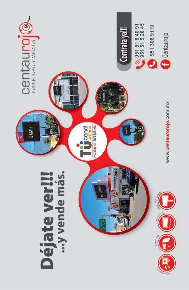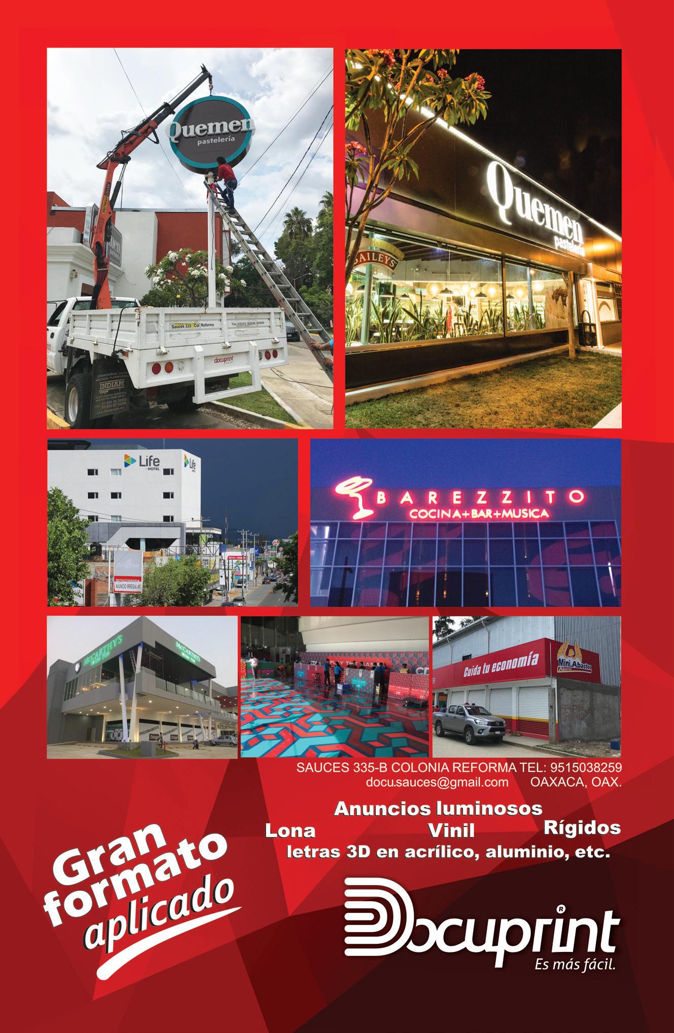 Hernán Sánchez Iniestra. Número de Reserva ante el Instituto Nacional del Derecho de Autor: en trámite. Certificado de Licitud de título y Contenido: en trámite. Domicilio: Sauces #333, Col. Reforma, Oaxaca de Juárez, C.P. 68050. El contenido de los artícul os y de los anuncios es responsabilidad de los autores y de las empresas. Queda prohibida la reproducción parcial o total del conten ido, imágenes y fotografía sin previa autorización por escrito de los editores. Impresa en: Talleres de Docuprint Digital Center SA. de C.V. Insurgentes No. 121, Colonia Lomas del Santo, San Agustín de las Juntas, C.P. 71238, Oaxaca.