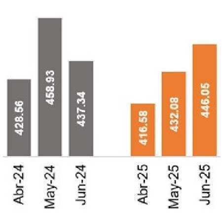 2.4% por debajo del precio promedio del mismo trimestre en el 2024 (II Trim. 2024: cUS$ 442.01 por libra).