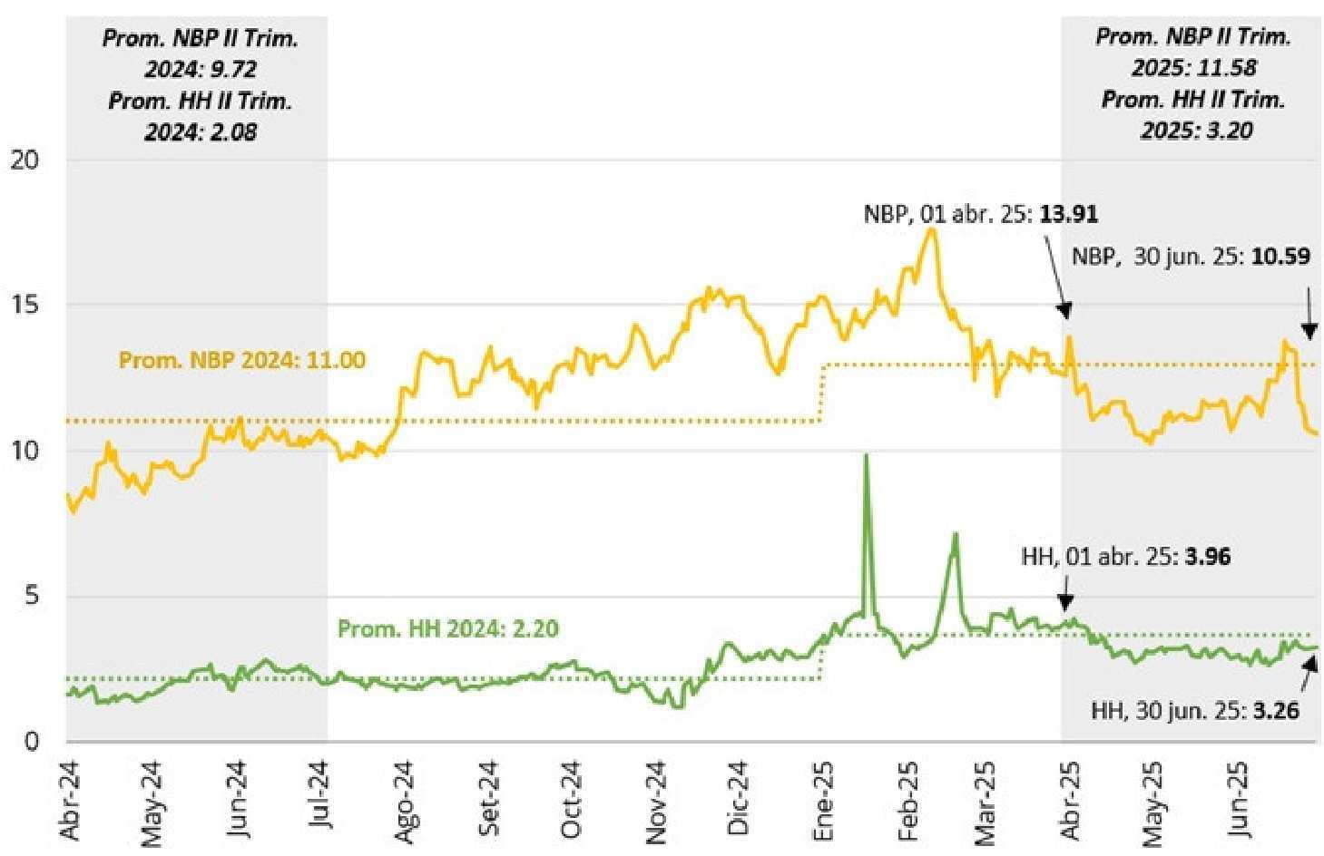 En el segundo trimestre de 2025, los precios del gas natural en los mercados de National Balancing Point (NBP) y Henry Hub (HH) mostraron una tendencia oscilante predominantemente descendente, aunque con variaciones puntuales. En abril, ambos mercados continuaron a la baja, influenciados por condiciones climáticas más cálidas y una oferta abundante. En EE.UU., el aumento de las exportaciones de gas natural licuado (GNL) hacia finales del mes, junto con un alza en el consumo eléctrico, contribuyó a moderar la caída de los precios del HH. En el Reino Unido, los precios del NBP descendieron por la menor demanda estacional, la estabilidad en el suministro y una reducción del riesgo geopolítico vinculado al conflicto entre Rusia y Ucrania. En mayo, el comportamiento fue más oscilante: el HH repuntó brevemente por una mayor demanda para generación eléctrica y por el dinamismo exportador, mientras que el NBP registró un leve repunte al inicio del mes, pero luego retomó su trayectoria descendente debido al restablecimiento de flujos desde Noruega y al incremento de la generación eólica. En junio, ambos mercados experimentaron subidas puntuales: en Europa, el NBP subió a mediados de mes ante el conflicto entre Israel e Irán, por temores de interrupciones en el suministro global, aunque los precios retrocedieron tras el anuncio de un alto al fuego; mientras que en EE.UU., el HH también registró un repunte moderado por previsiones de mayor demanda y por el contexto internacional, aunque se mantuvo más estable gracias a la solidez en la oferta. En conjunto, el trimestre estuvo marcado por un entorno bajista, con presiones puntuales al alza que no alteraron la trayectoria general, siendo el HH el mercado que mostró un comportamiento más estable.