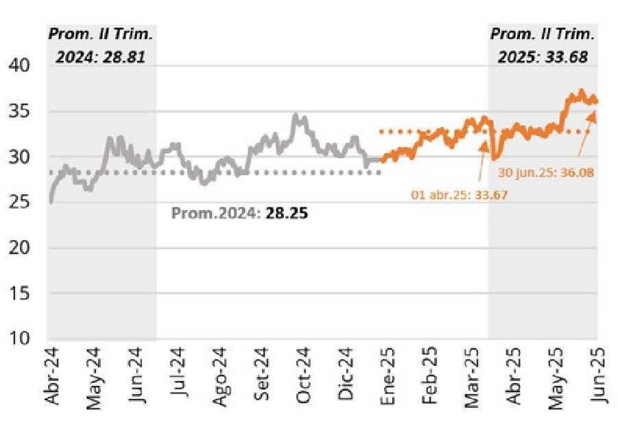 El precio promedio del II Trimestre 2025 (US$ 33.68 por onza troy) fue: