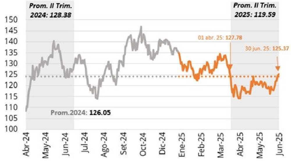 6.8% menor que el precio promedio del mismo trimestre del 2024 (II Trim. 2024: cUS$ 128.38 por libra).