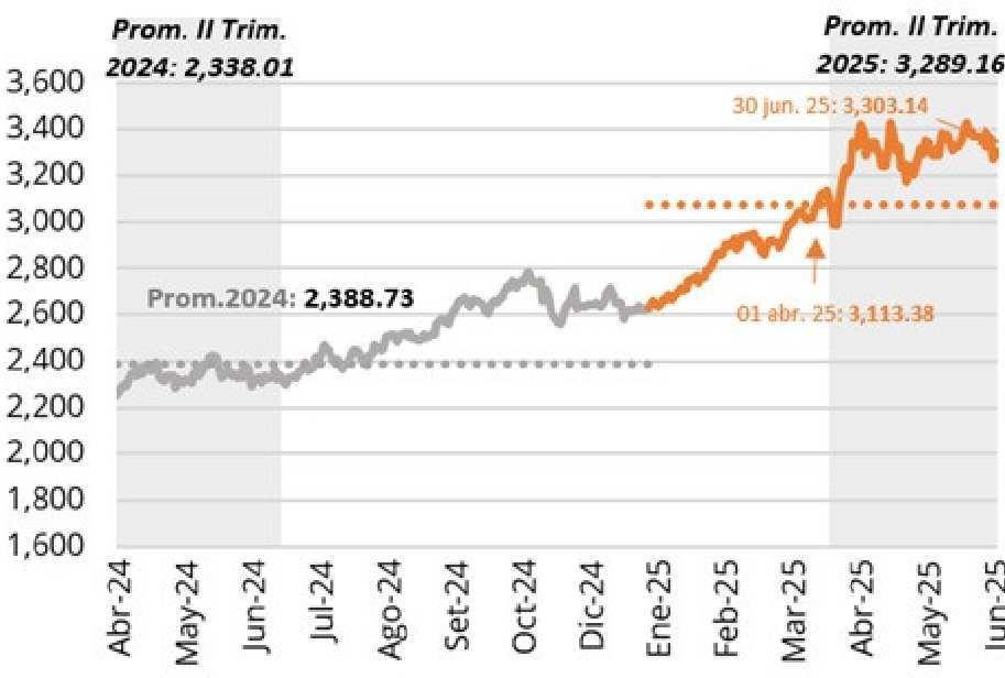En el segundo trimestre de 2025, el precio del oro registró un comportamiento volátil, aunque en niveles elevados, en un contexto de variaciones en el dólar, los rendimientos de los bonos del Tesoro y episodios de riesgo geopolítico. En abril, la cotización subió impulsada por la depreciación del dólar y la caída de los rendimientos, alcanzando un máximo histórico en la tercera semana. En mayo, el precio experimentó altibajos: cayó inicialmente por la moderación de las tensiones comerciales, pero se recuperó parcialmente ante la incertidumbre fiscal en EE.UU y la depreciación del dólar. En junio, el oro registró una leve tendencia a la baja, debido a la apreciación del dólar y la disminución de los riesgos geopolíticos tras el alto al fuego entre Israel e Irán, aunque se mantuvo por encima de los niveles observados a inicios de año.