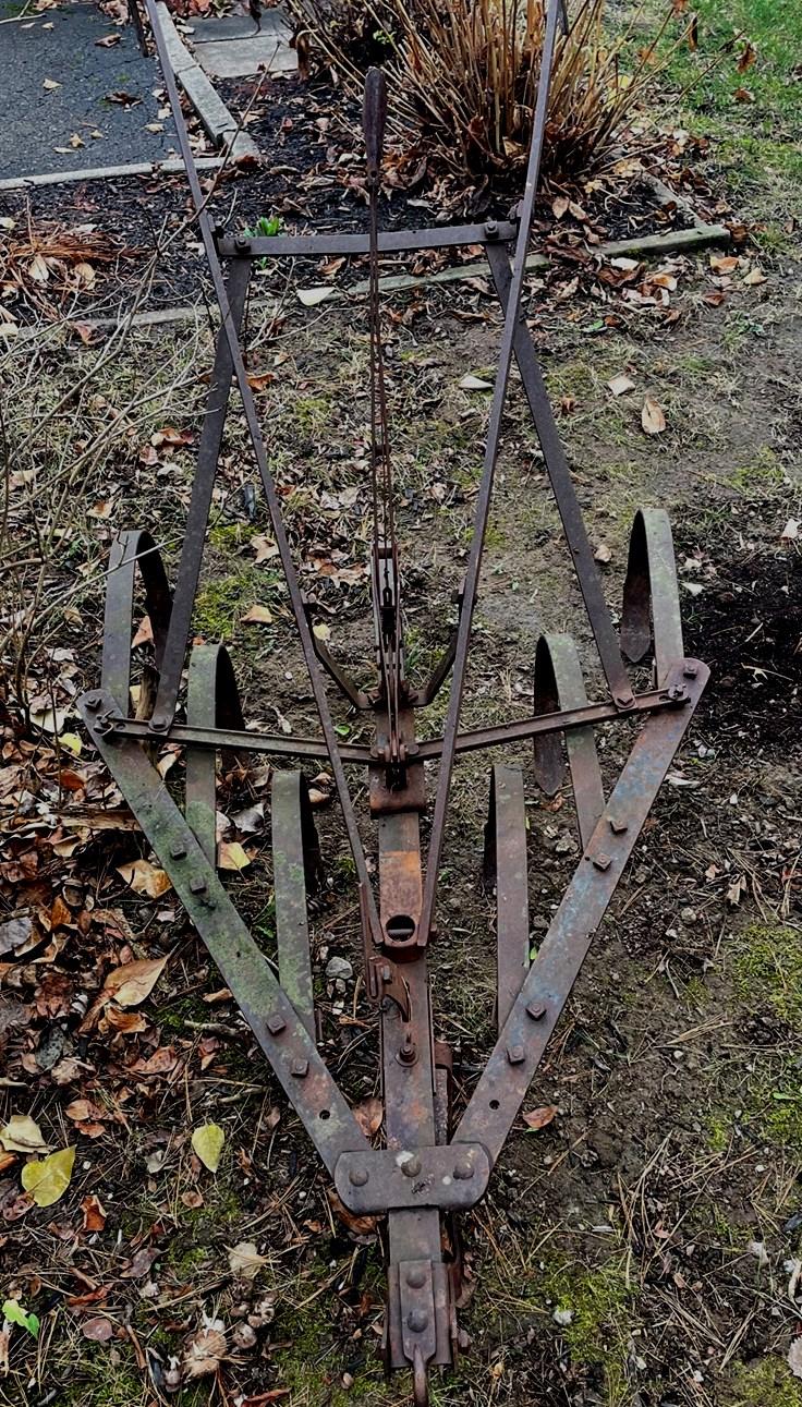 Voici un autre instrument aratoire, un sarcleur. Celui-ci servait à sarcler la terre, plus précisément à enlever les mauvaises herbes entre les rangs de culture. Comme on peut voir au centre, il y a un bras qui sert à élargir ou rétrécir tout selon la largeur des rangs de culture. Ça me rappelle de très beaux souvenirs puisque mon grand-père maternel en possédait un pareil qu’il avait modifié pour être tiré par son tracteur. Je me souviens d'avoir conduit le tracteur pendant que lui manœuvrait le sarcleur.