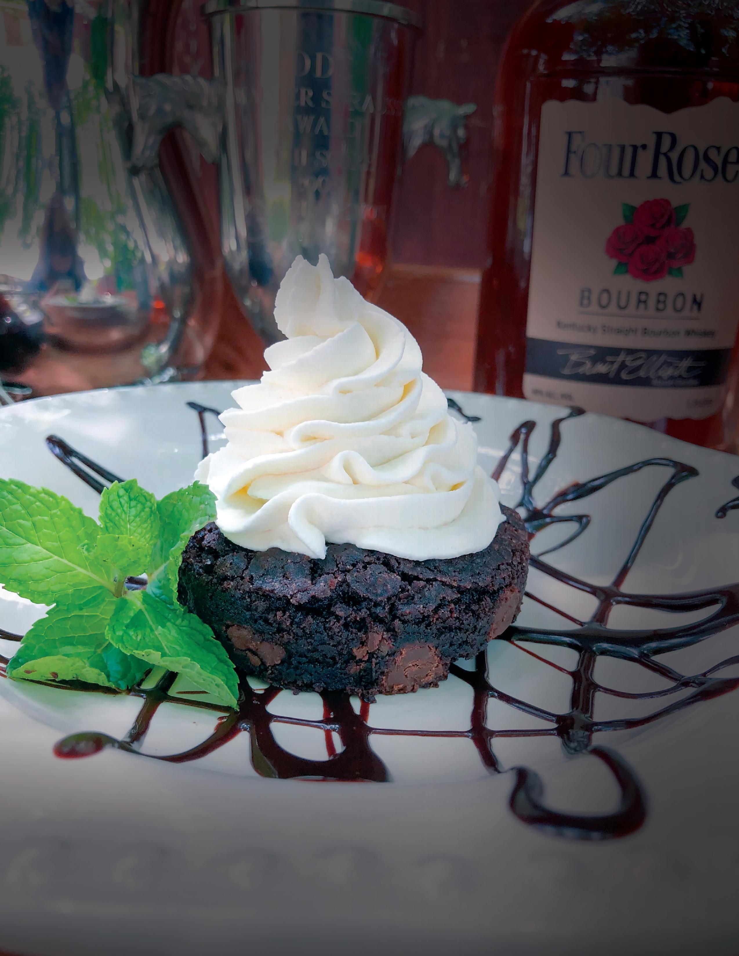 (5) Remove the brownies from the oven and let cool completely before cutting into rounds with a biscuit cutter. Pipe on bourbon whipped cream (recipe link on left) and drizzle with dark chocolate mint fudge sauce (recipe link on left) .