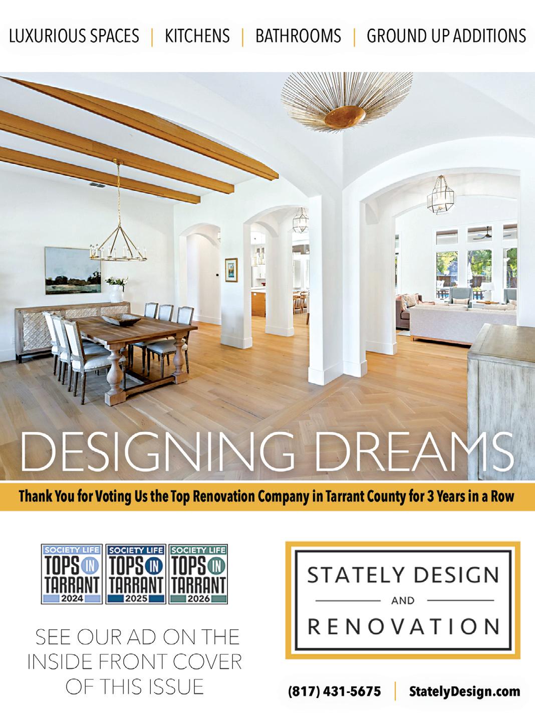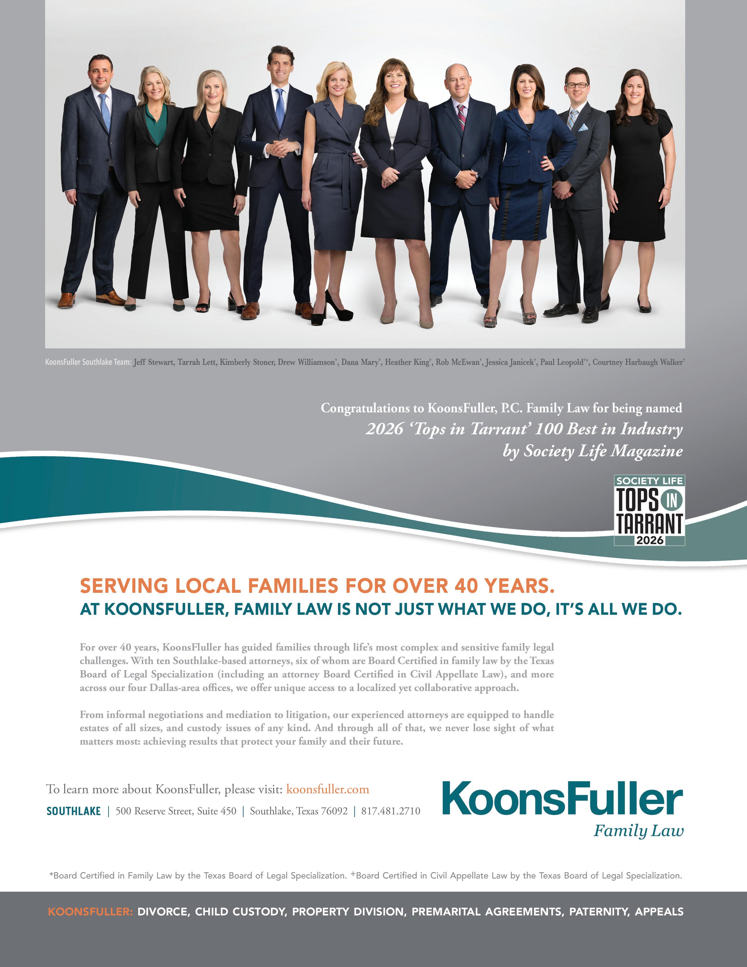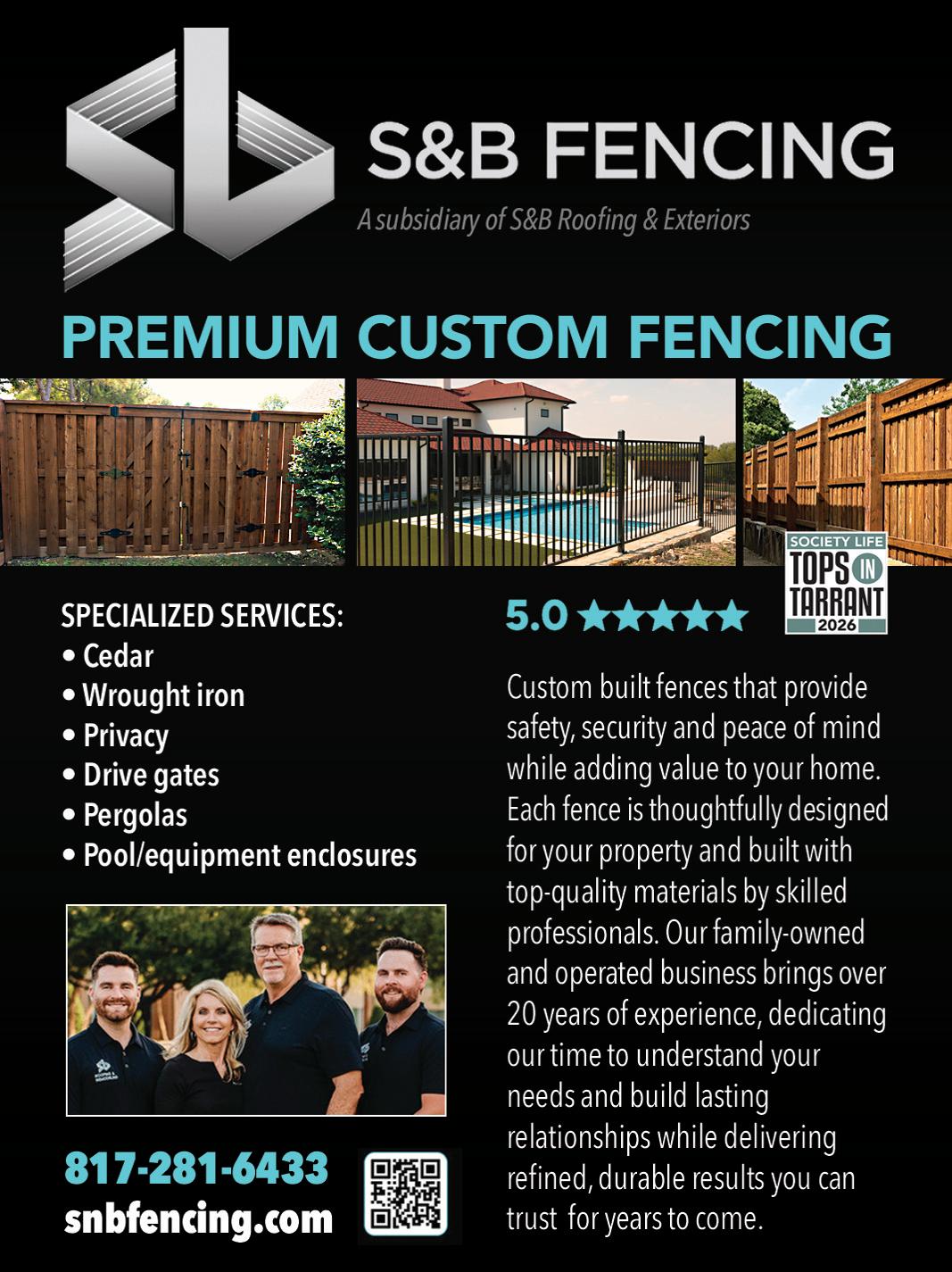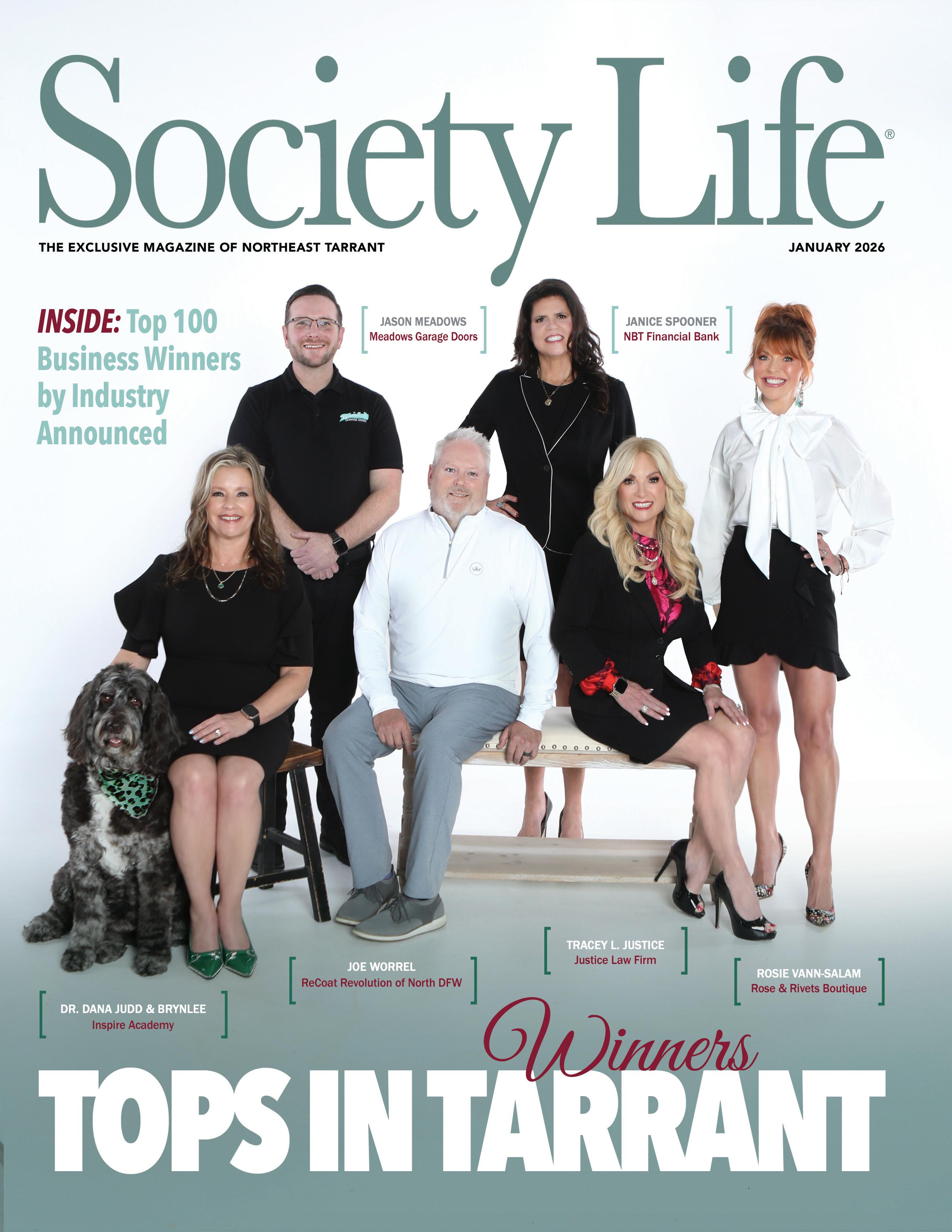 The Society Life ‘Tops in Tarrant’ list is a result of a website-based survey from the 4th quarter (October, November, December) of 2025 requesting suggestions for the top local leaders of each listed industry. The 100 industry categories were chosen by the Society Life magazine editorial staff. It was suggested that any business who serves the residents of Northeast Tarrant County was eligible—including, but not limited to, Society Life magazine advertisers. If any business was nominated for multiple industries, it appears under only one industry as decided by the Society Life staff. There are no duplicate business listings allowed—each business may appear only once in the Top 100 which includes only the Top nomination under each of the 100 industry categories. The final numbers are confidential and anonymous. The resulting list in this issue reflects the companies who received the most votes from the final survey nominations. All of the listings are alphabetical by their respective industry category—they are not listed by number of votes or any other such ranking or order.