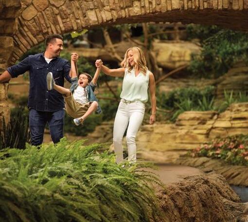 MORE THRILLS There’s no better way to beat the summer heat than making a splash at Paradise Springs, the resort’s 10-acre outdoor waterpark. Adults can grab a cocktail and tube down the relaxing 600-footlong lazy river while kids play in a giant water tree house, glide down four winding waterslides, and splash around in the 6,000-square-foot family lagoon. The pool comes alive each weekend with a live DJ, hair braiding, airbrush tattoos, and interactive games. Private cabanas are available for rent with extra shade, soft seating, TVs, and refrigerators.