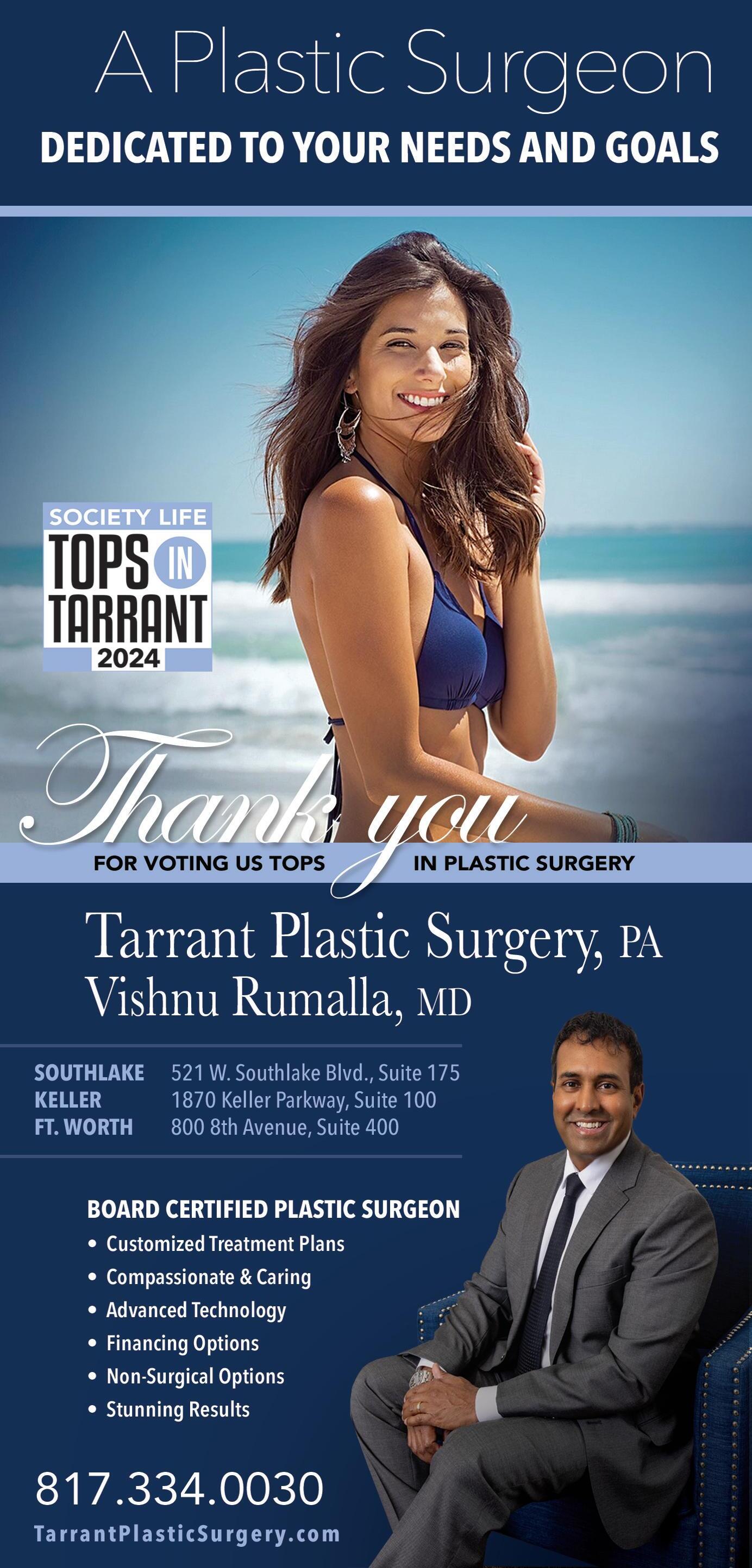 HOW THE TOPS IN TARRANT WINNERS WERE CHOSEN: The Society Life ‘Tops in Tarrant’ medical list is a result of a website-based survey requesting suggestions for the top medical practice under each listed specialty. The 100 specialties were chosen by the Society Life editorial staff. It’s suggested that any medical practice serving the residents of Northeast Tarrant County was eligible—including, but not limited to, Society Life Magazine advertisers. If any practice was nominated for multiple specialties, it appears under only one category as decided by the Society Life staff. There are no duplicate business listings allowed—each practice may appear only once in the top 100. The final numbers are confidential and anonymous. The resulting list on pages 40-41 of this issue reflects who received the most votes from the final survey nominations. All listings are alphabetical under their respective medical specialty—they are not listed by number of votes or any other ranking.
