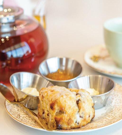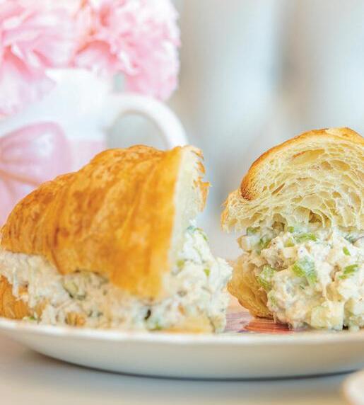The menu at the tea room features what you would expect at such, but reimagined even better. My not-to-bemissed items here are undoubtedly the chicken salad croissant and the bacon rosemary scone. The chicken salad, while being nostalgic in flavor, takes on a new refreshing texture with very finely chopped green apple and green bell pepper. Each bite includes all flavors as opposed to the traditional, chunky, what-am-I-going to get next style. The bacon rosemary scone is an unexpected savory twist on an otherwise sweet treat. It’s a perfect on-the-go breakfast or lighter lunch. The bacon provides a little saltiness. The gruyere cheese provides a creaminess. Craisins throw in a bit of sweetness and the rosemary provides that finish you were not expecting.