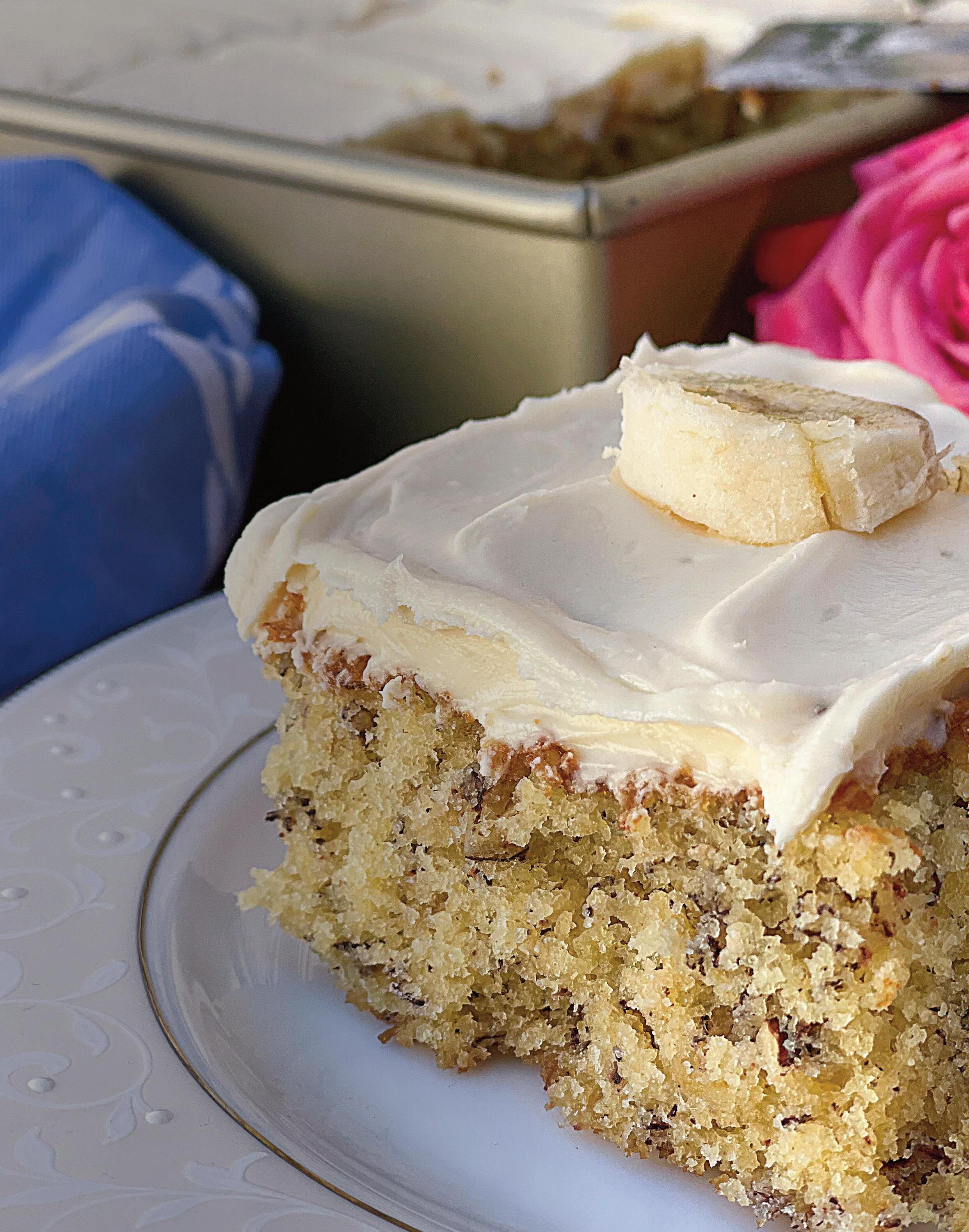 You won’t believe how easy and delicious this banana cake is and the cream cheese frosting is absolutely to die for! Just look at how luscious the frosting is. There is something so laid-back about a sheet cake. It’s not too fancy, not too serious, just perfect for a weeknight sweet treat. And yet served with fresh banana slices on top and a cup of decaf coffee, this cake is delicious enough to serve at a dinner party. We love a cake that can do both! Fun fact: this is one of Mama Rose Table’s recipes and was the cake she baked for my older brother’s first birthday, meaning this recipe is older than I am!
