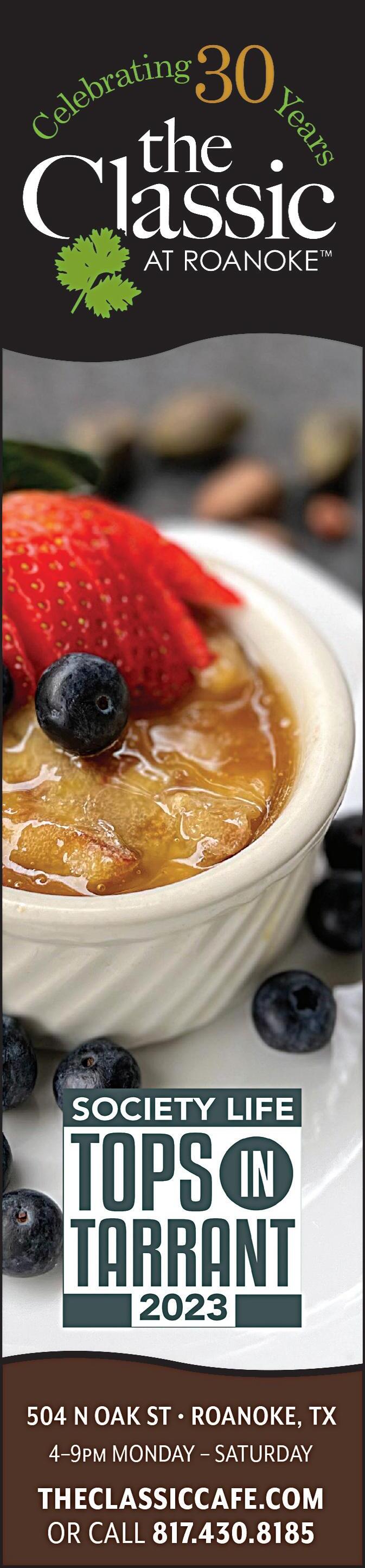 Del Frisco’s Grille • Spend the day shopping the square before meeting for dinner and drinks. Luxurious dining room or patio. Local flavor—diverse menu has something for everyone. • Southlake delfriscosgrille.com $$-$$$ (Brunch) L D