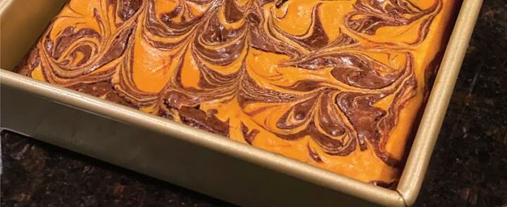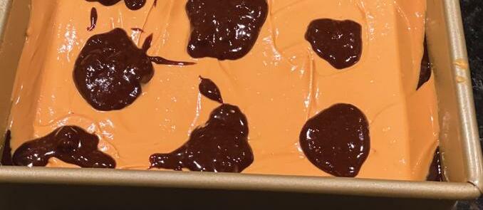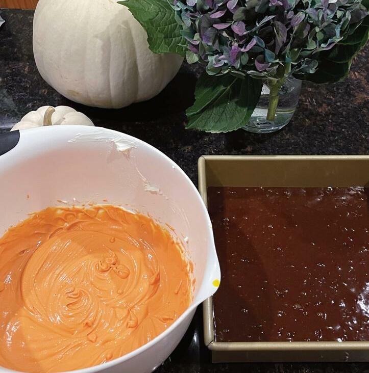 and yellow food coloring to tint desired shade of orange. (Or use orange food coloring for a more vibrant look.) Pour cheesecake mixture on top of brownies, carefully spreading to over the brownie layer to the edge.