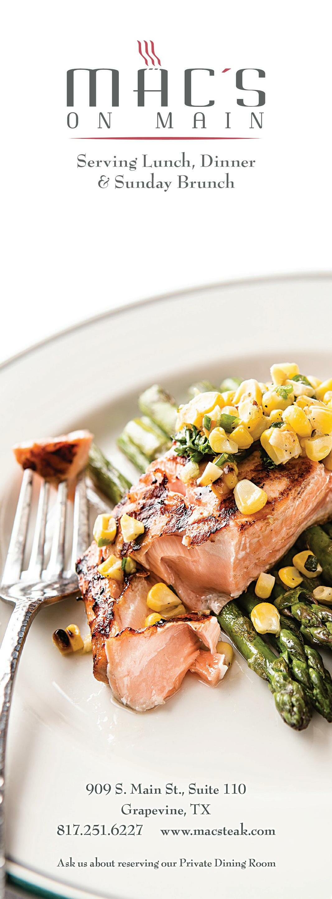 Mac’s on Main • Southwestern, cajun and global influences. Steaks, signature prime rib and seafood. Cocktails, beer, 30+ single malt scotches, wine list. Locally owned and operated, oneof-a-kind. • Grapevine macsteak.com $$ (Brunch) L D