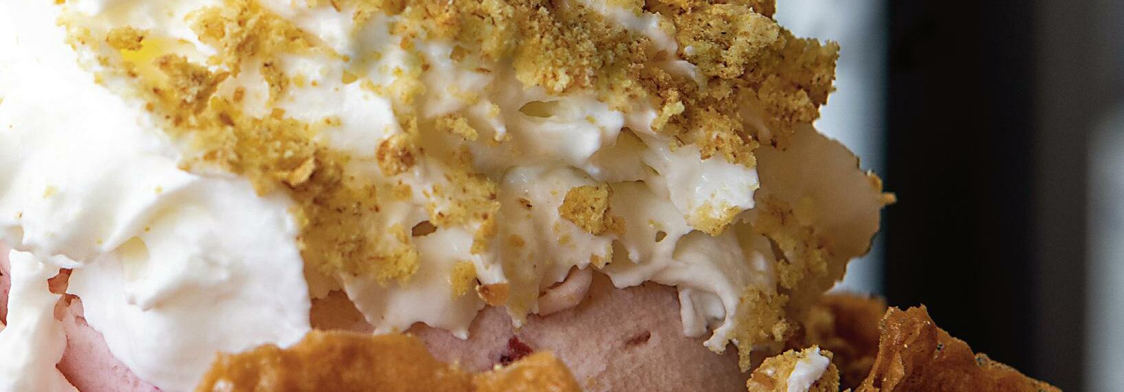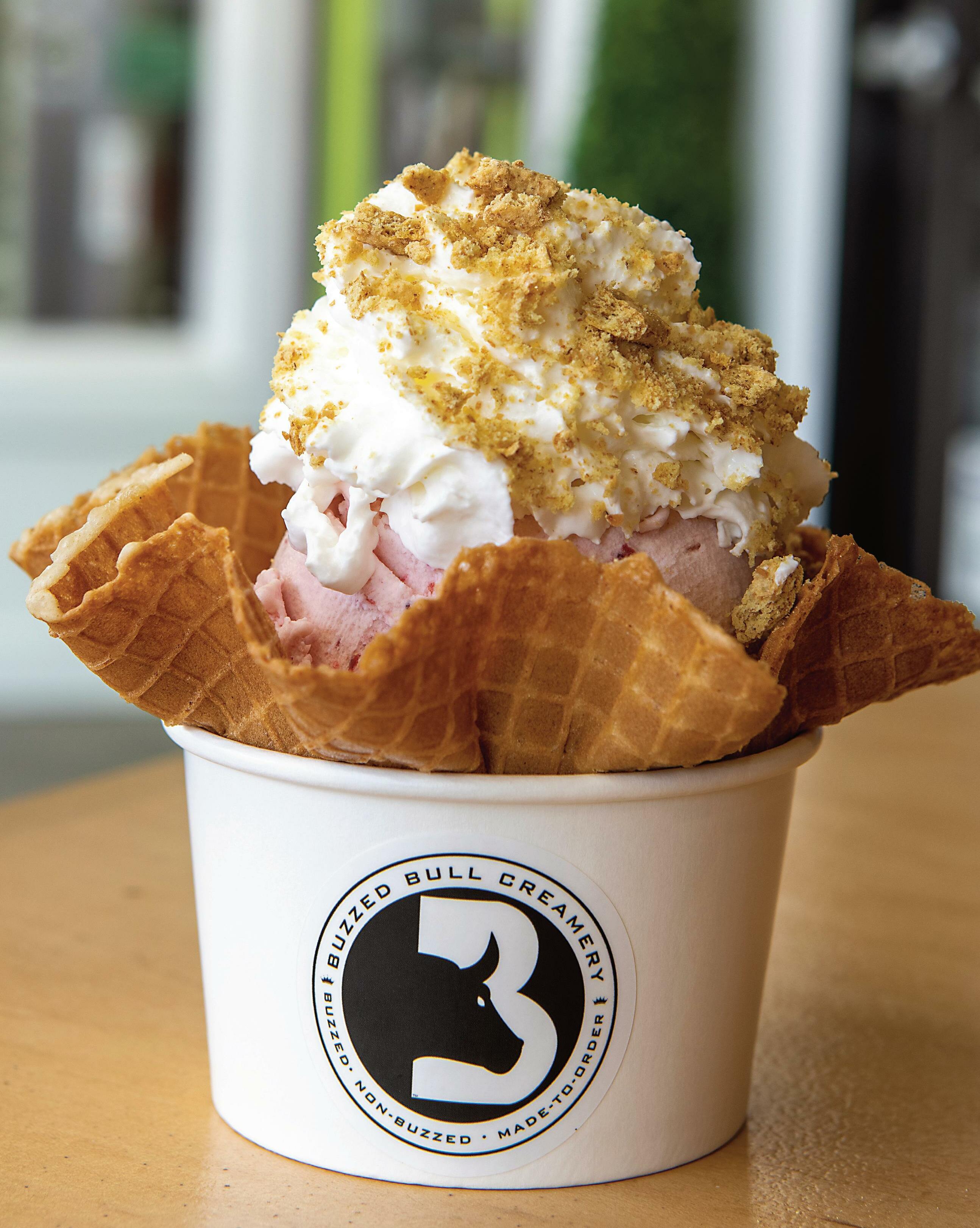 icy sorbet. Step 2: Pick your flavor. With well over a dozen to choose from, this will be your hardest step. Of course, there’s classic vanilla and chocolate, but if you’re feeling extra creative, there’s also peanut butter, Nutella, cake batter, honey, brownie batter, pineapple and coconut—just to name a few. Step 3: Pick your mix-ins and toppings. Along with your favorite candies, there’s also a variety of nuts, waffle cone pieces, brownie bites and cookie dough. The final and optional adults-only step is to “Buzz It” by adding vodka, bourbon, whiskey, gin, spiced rum, rum or tequila. This may sound odd as most of us aren’t used to such a combo. Here are some of Buzzed Bull’s buzzy creations for inspiration: