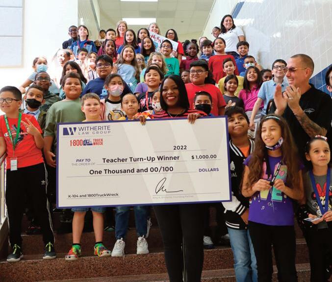 Witherite Law Group recently awarded $1,000 each to two DFW area teachers to help cover classroom expenses. Teachers from the metroplex were nominated by the community through a contest called “Teacher Turn Up” during the month of September. Teachers were nominated via online submission at myk104.com and two teachers were selected every Tuesday in September and awarded $1,000 each, particularly exceptional teachers and those with specific classroom needs. On Friday, September 23, attorneys from Witherite Law Group surprised winners in person with a $1,000 check. The “Teacher Turn Up” recipients include Coach D.Q. Piolet of North Dallas High School and Jonyelle MayesBuchanan of Dr. Linda Henrie Elementary School. “Teacher Turn Up” campaign ran until the end of September and recognized 10 teachers in the DFW area and awarded a total of $10,000 for classroom funding.