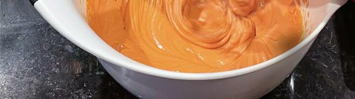 The key here (and with all cream cheese recipes) is to have the cream cheese at room temperature. Do not use cold cream cheese. It will not blend properly. You can use orange food coloring if you want a really vibrant color, but most grocery stores don’t carry orange, so just mix red and yellow together. I used about equal parts of each and just kept going until I got a shade of orange I liked.