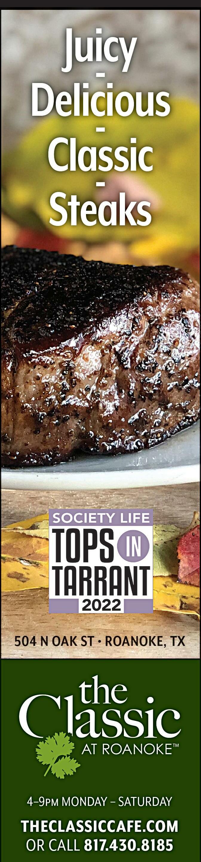 The Classic at Roanoke • Unlikely fine dining destination. Nicely focused menu serving grilled steaks and seafood. Worldclass food, casual atmosphere, family friendly environment. A true classic. • Roanoke theclassiccafe.com $-$$ L D R