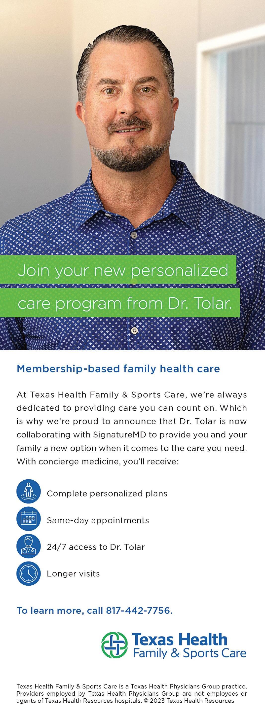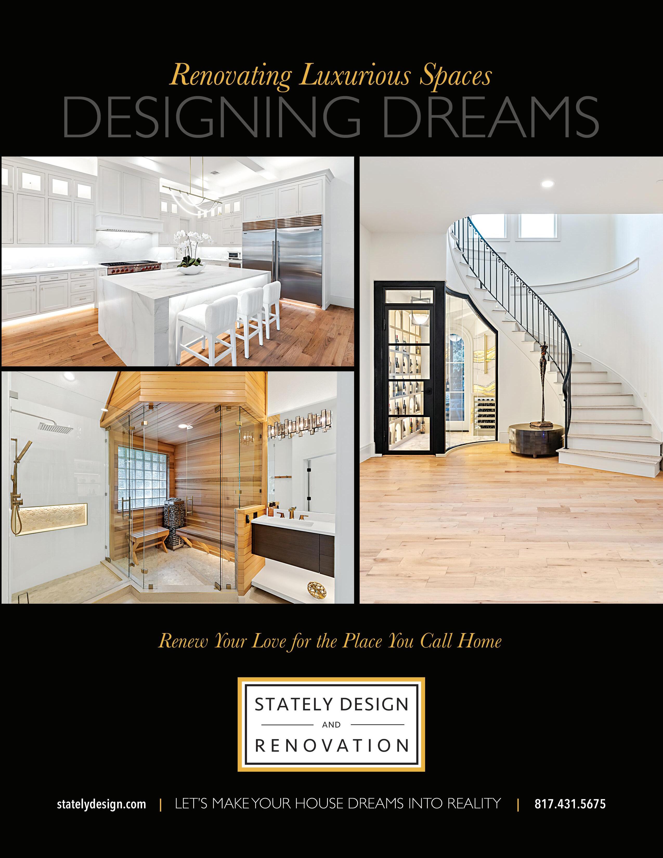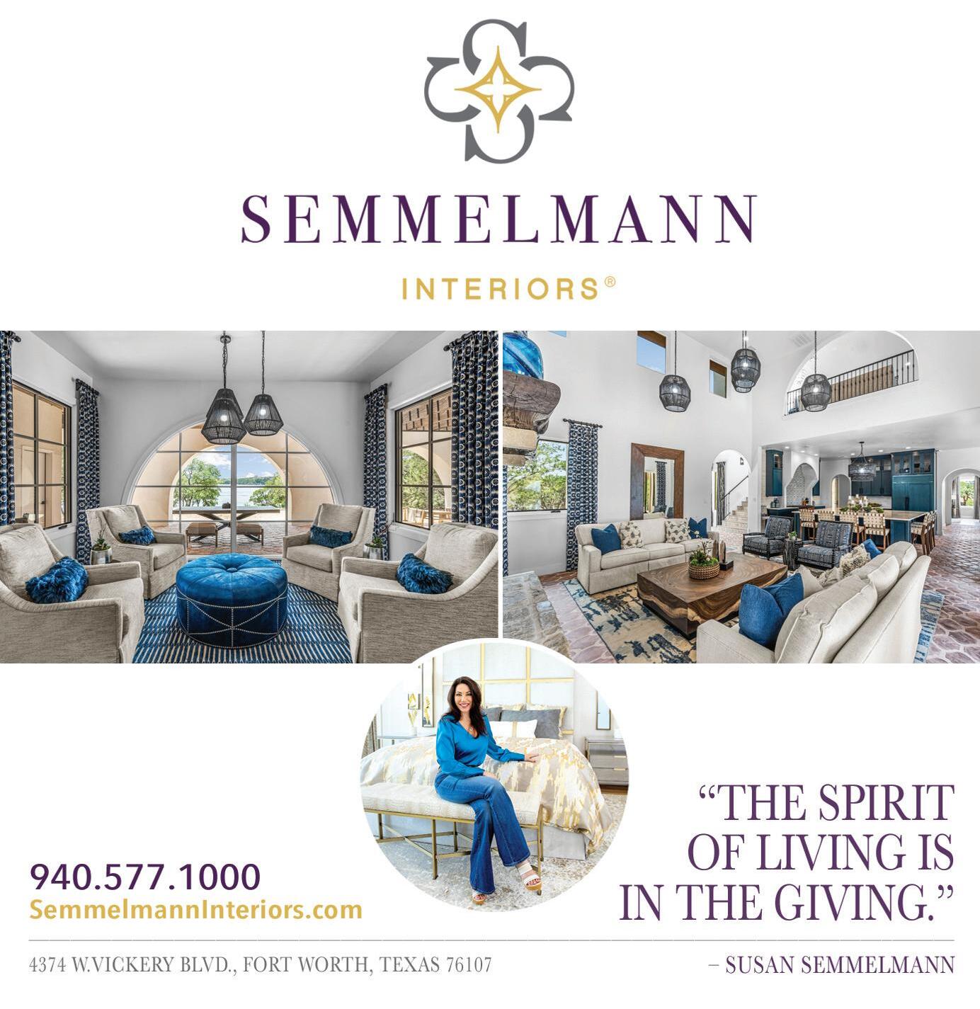 Everyone knows that home is more than just bricks and mortar. It is the epicenter of our lives and what defines home for each of us varies as much as we do. Home should be a place where we are free to be ourselves, where we find acceptance, love, and warmth. From well-known sayings like, “There’s no place like home,” “Home sweet home,” and “Home is where the heart is,” we surmise that home should be a happy place. This is the mission and purpose for one local charity I am proud to support—CASA of Tarrant County (Court Appointed Special Advocates). It’s a special organization of volunteer advocates who stand up on behalf of abused and neglected children. They aim to provide a CASA volunteer to every child who needs one—and they do so through fundraisers like the upcoming CASA Kids on Canvas (see article starting on page 68). By raising a voice against the unspeakable and speaking up for a child, they help find a happy home where love and warmth are the foundation for their future success. Both the child and their advocate are fulfilled by this bond. In a world filled with uncertainty and challenges, home should provide us with a stable anchor. It is a shelter from the storms of life, a place where we can let our guard down, and a fortress that shields us from the outside world. Home fosters personal growth. It’s the space where we dream, explore, and evolve. Whether it’s a quiet corner for reading, a kitchen where we experiment with recipes, or a backyard where we tend to a garden, or spend quality time with friends and family— our homes facilitate our passions and hobbies, nurturing our intellectual and creative sides. Learn how to make the most of your home and add value to your investment (Home Upgrades page 19). We forge bonds within its walls. Home is where families are formed and strengthened, where children take their first steps, where we celebrate milestones and holidays, and where we lean on each other during tough times. Home is the backdrop to the stories of our lives. The pandemic has made us appreciate home again, and it’s become a symbol of resilience and adaptability.