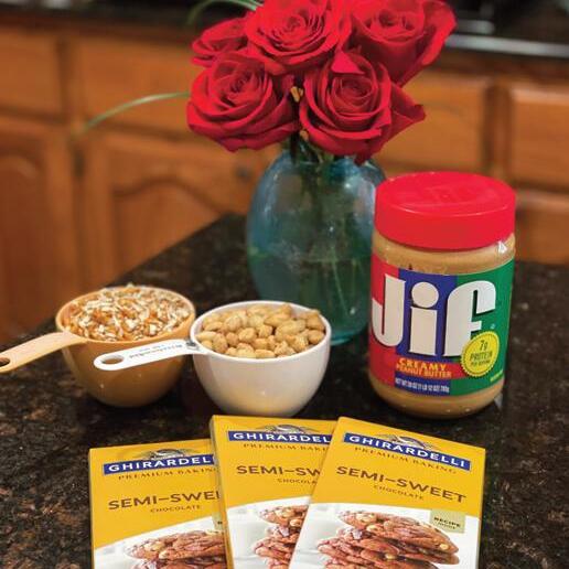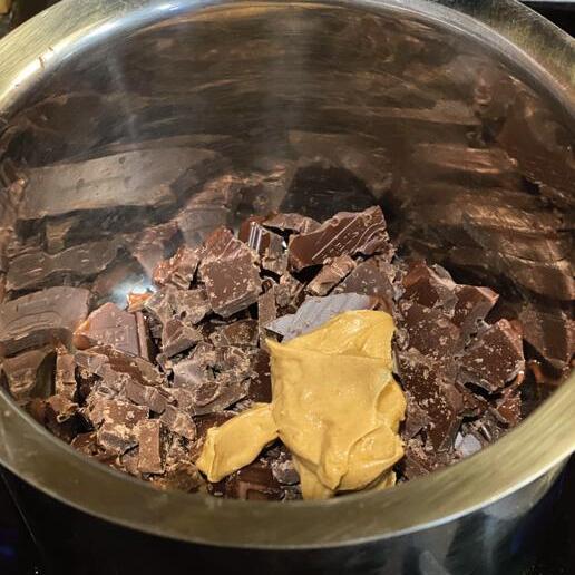 (1) Melt baking chocolate and peanut butter in a double boiler or at half power in the microwave. .................................................................................................